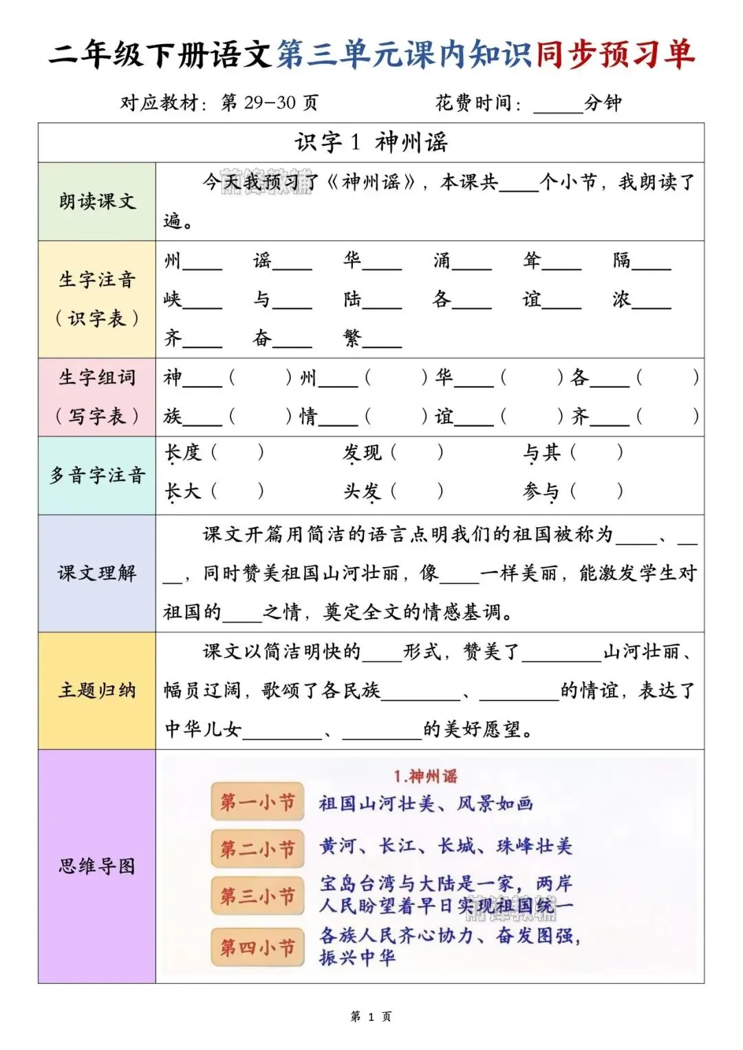26春二年级下册语文第三单元课内预习单(电子版可打印)