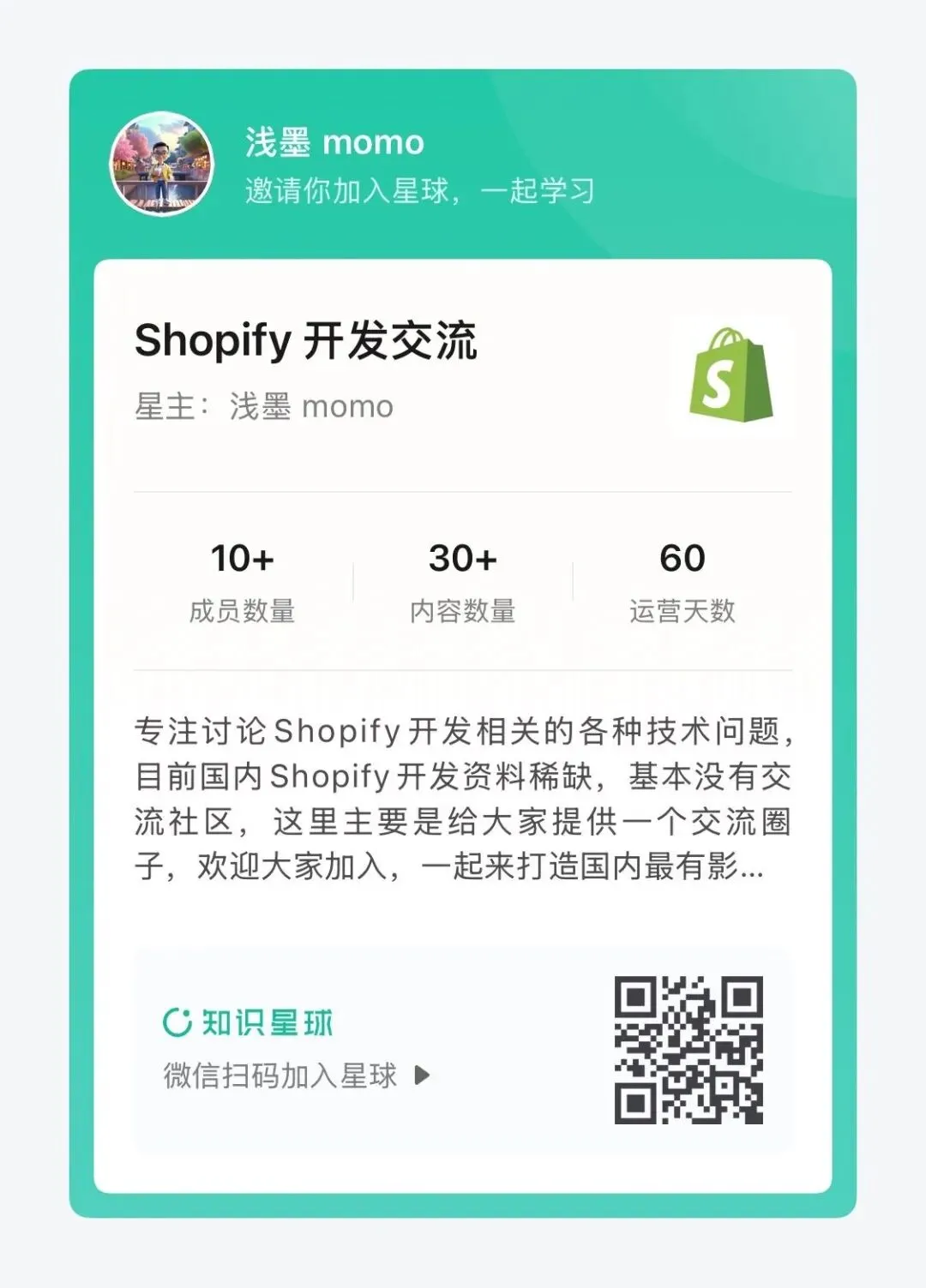 目前国内Shopify开发资料稀缺,基本没有交流社区,所以我创建了一个专注讨论Shopify开发相关的各种技术问题的交流圈子,如果你正在做 Shopify 相关的开发,或者准备入坑,或者已经被各种坑折磨到怀疑人生,那我真心邀请你加入这个知识星球,我们一起来打造国内最有影响力的Shopify开发社区。