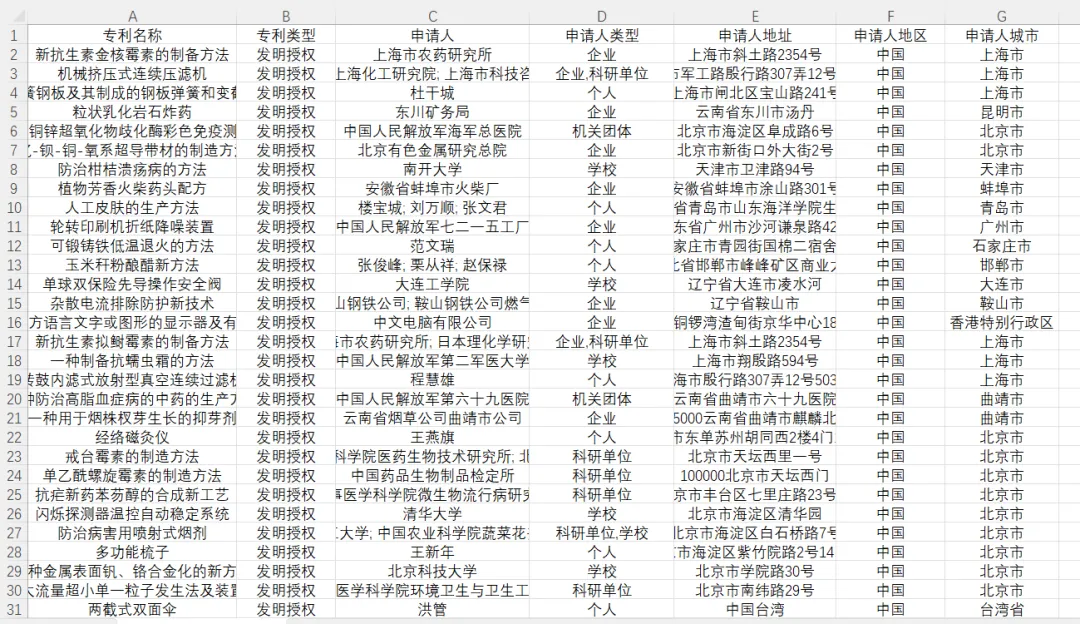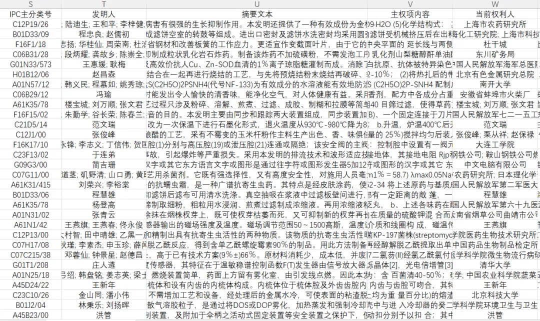 数据内容包括专利名称、专利类型、申请人、申请人类型、申请人地址、申请人地区、申请号、公开公告号、摘要文本、主权项内容、当前权利人、IPC分类号、发明人、专利引用等信息。