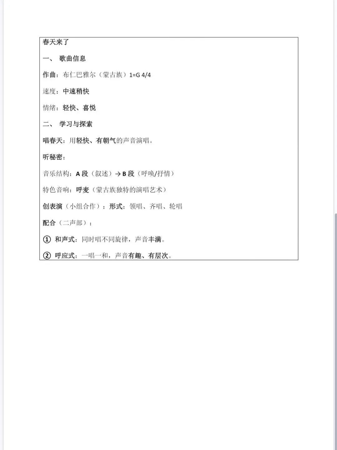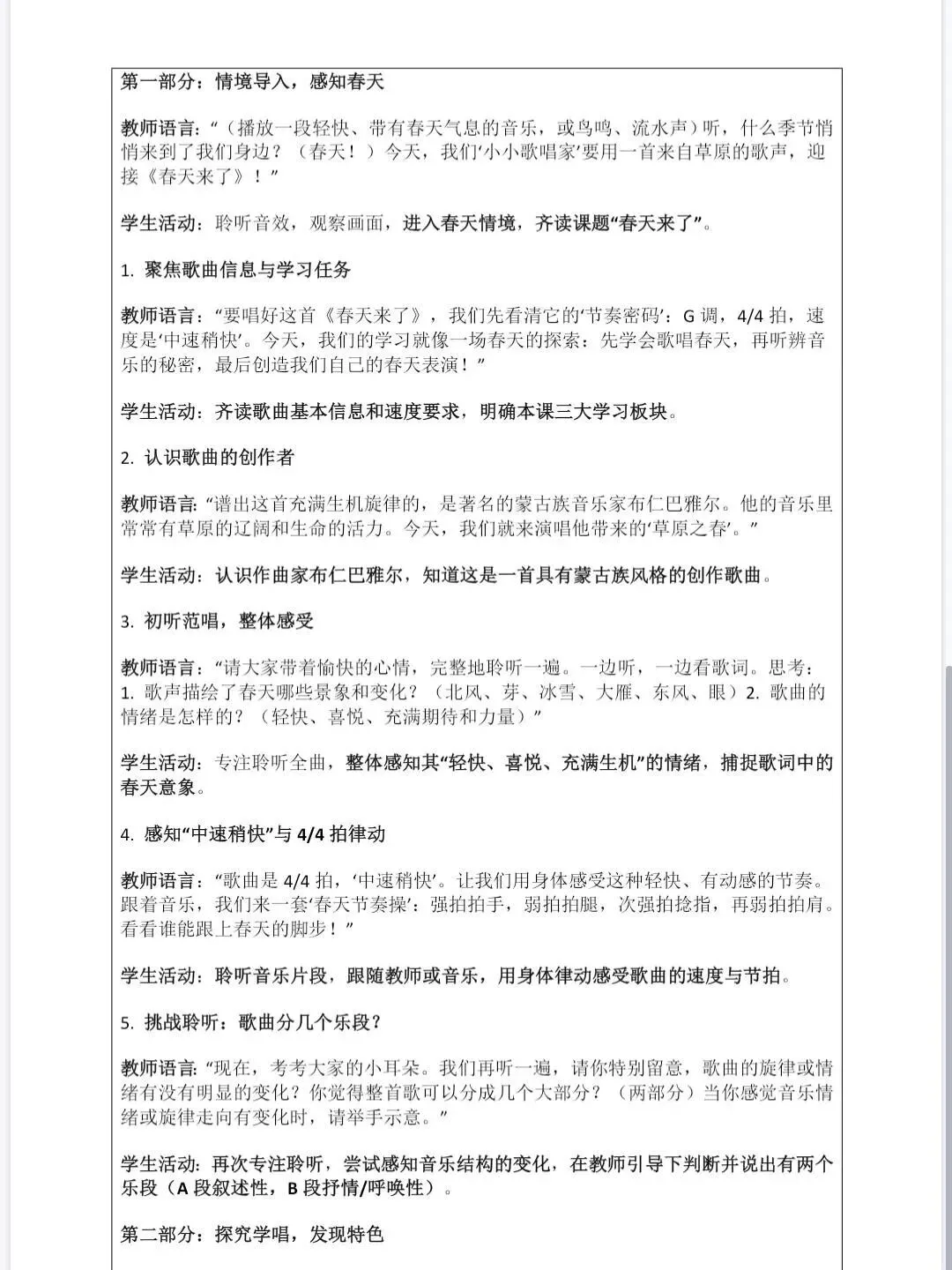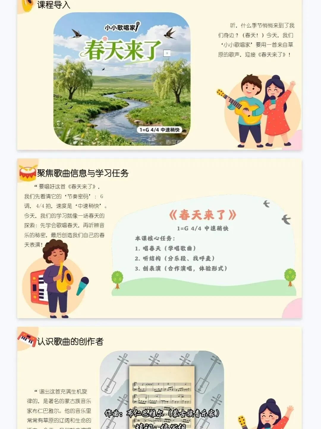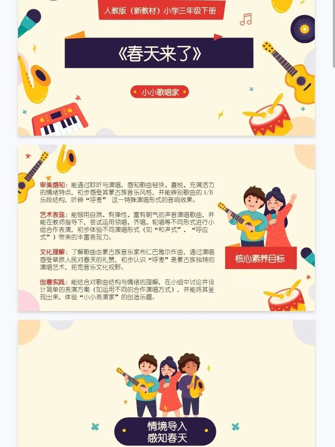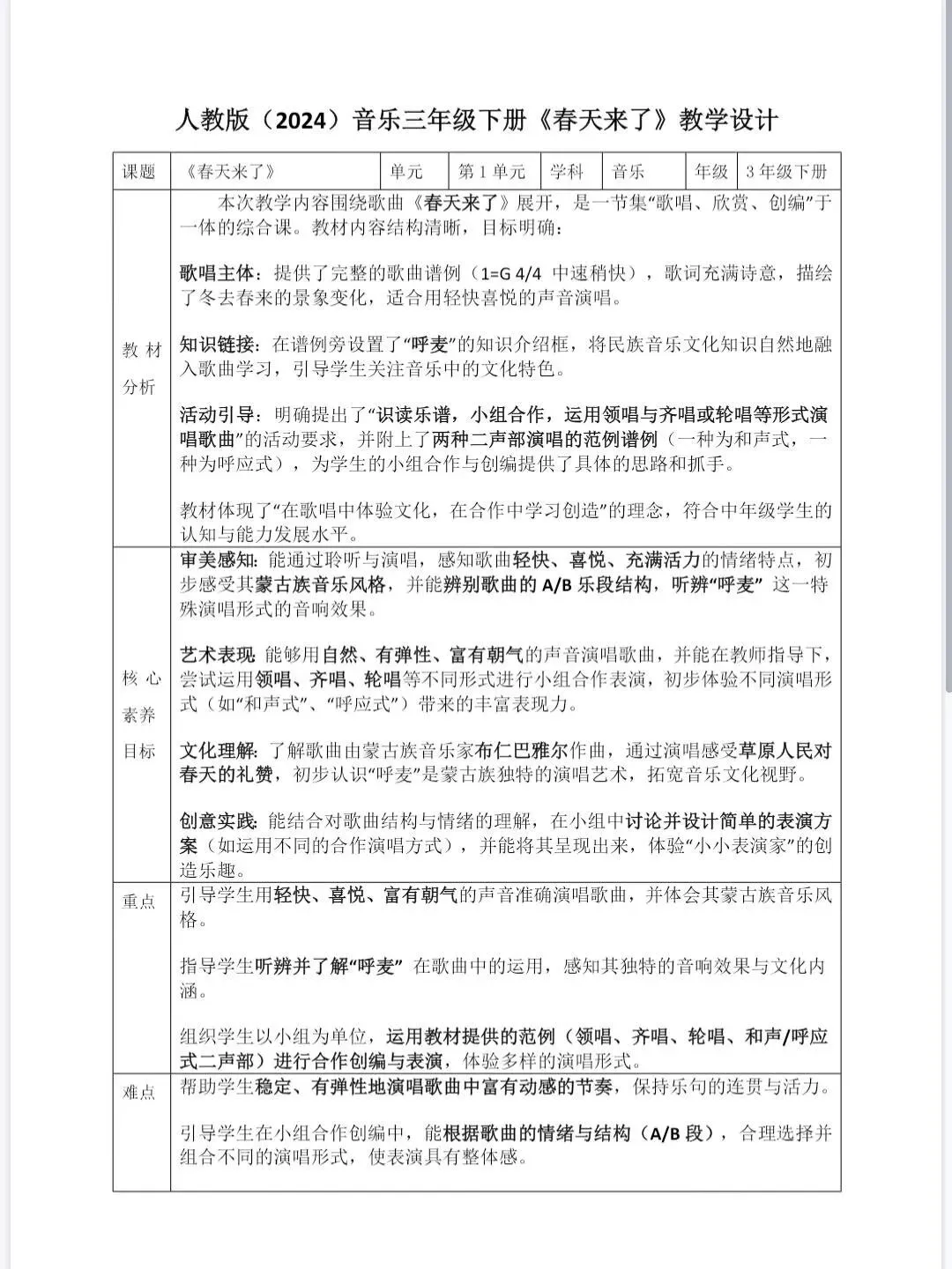 [庆祝R]部分高清电子版已上传至小红书附件,可直接下载![庆祝R [庆祝R]部分高清电子版已上传至小红书附件,可直接下载![庆祝R]完整版及更多资料在评论区自取~ [开箱R]资料完美贴合教材,重点看春天来了,从核心素养目标到教学重难点,再到情境导入、识读乐谱、小组合作演唱等完整教学流程,每一步都标注清晰的师生活动和设计意图,还有配套课件PPT! [飞机R]电子版可打印,有了它,备课教学轻松拿捏! 本文内容来源于网络 版权归原作者所有、如有侵权,联系删除 完整资料获取 扫码获取 第一步|微信扫码 第二步|添加后发送想要的资料链接咨询获取!