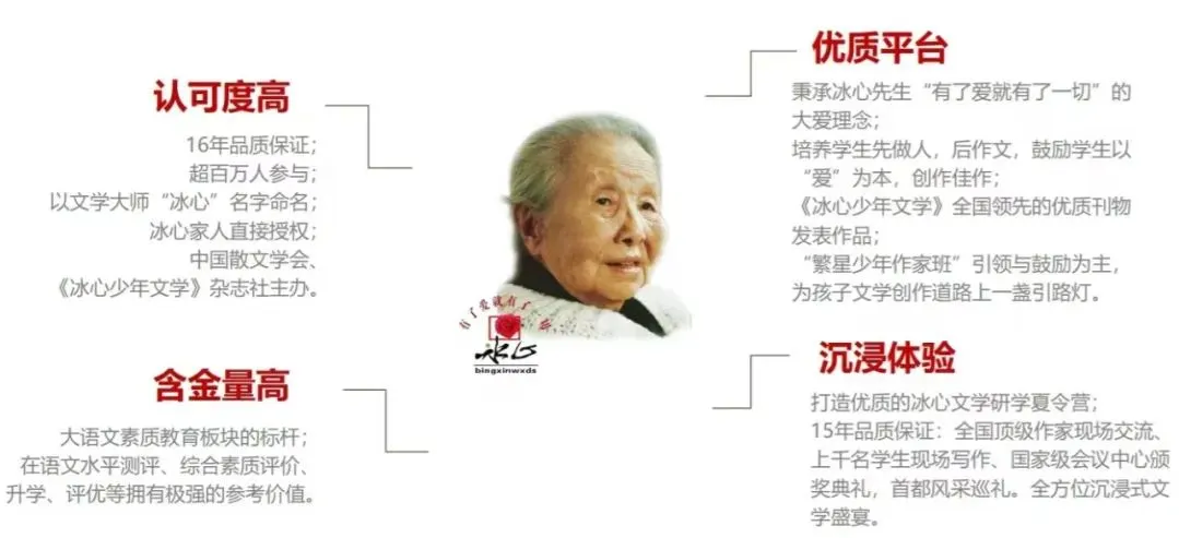 培养文学素养传承冰心先生“真善美”的大爱精神,通过命题写作、自由创作等形式,激发青少年文学兴趣,提升文学素养,帮助树立正确的价值观与世界观。