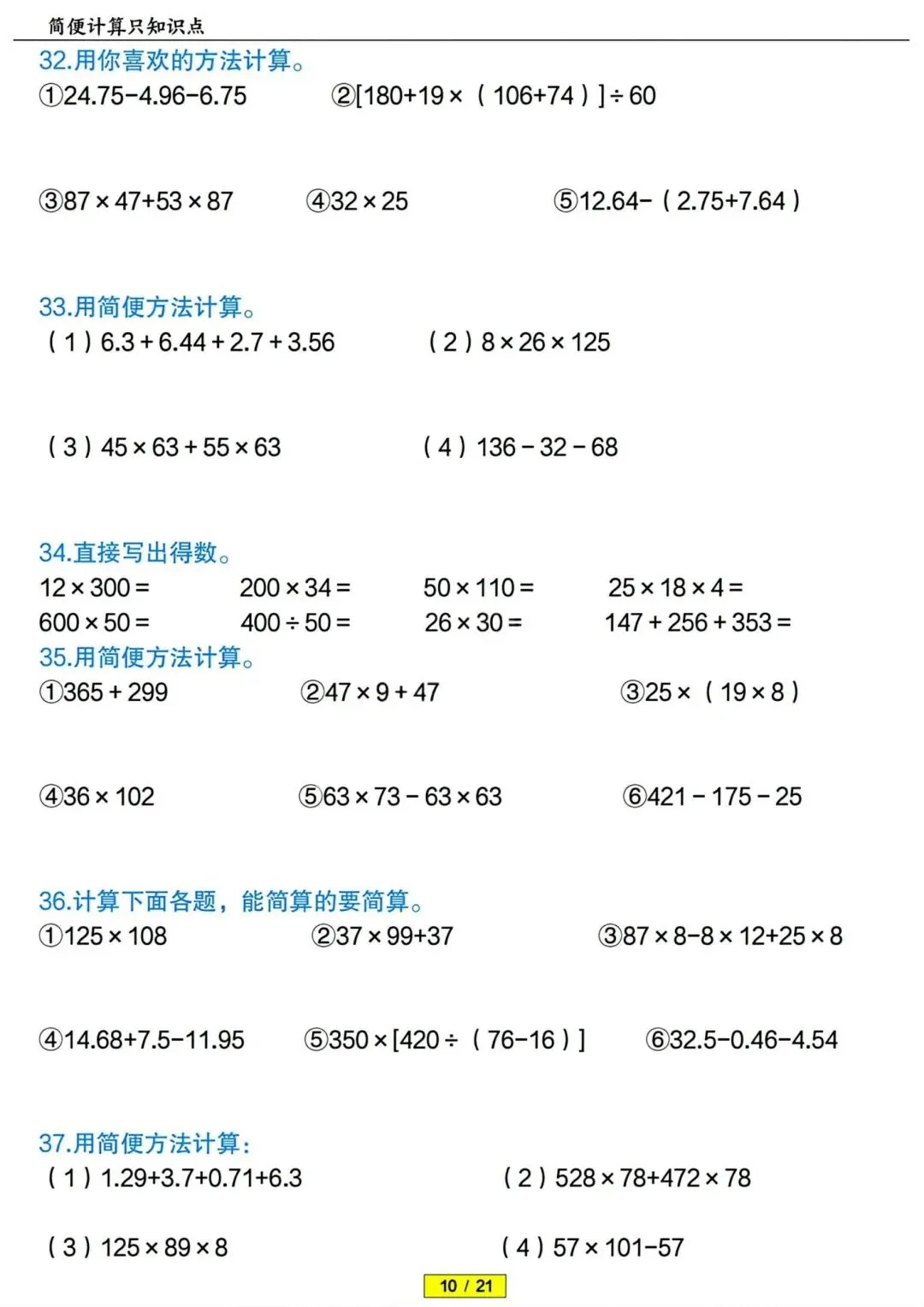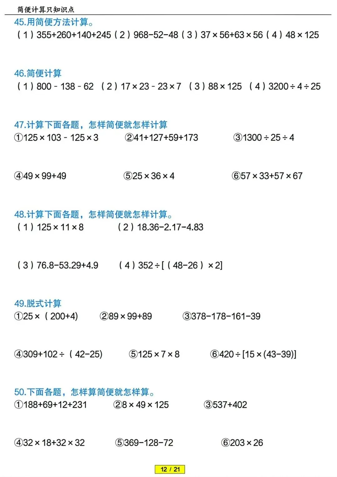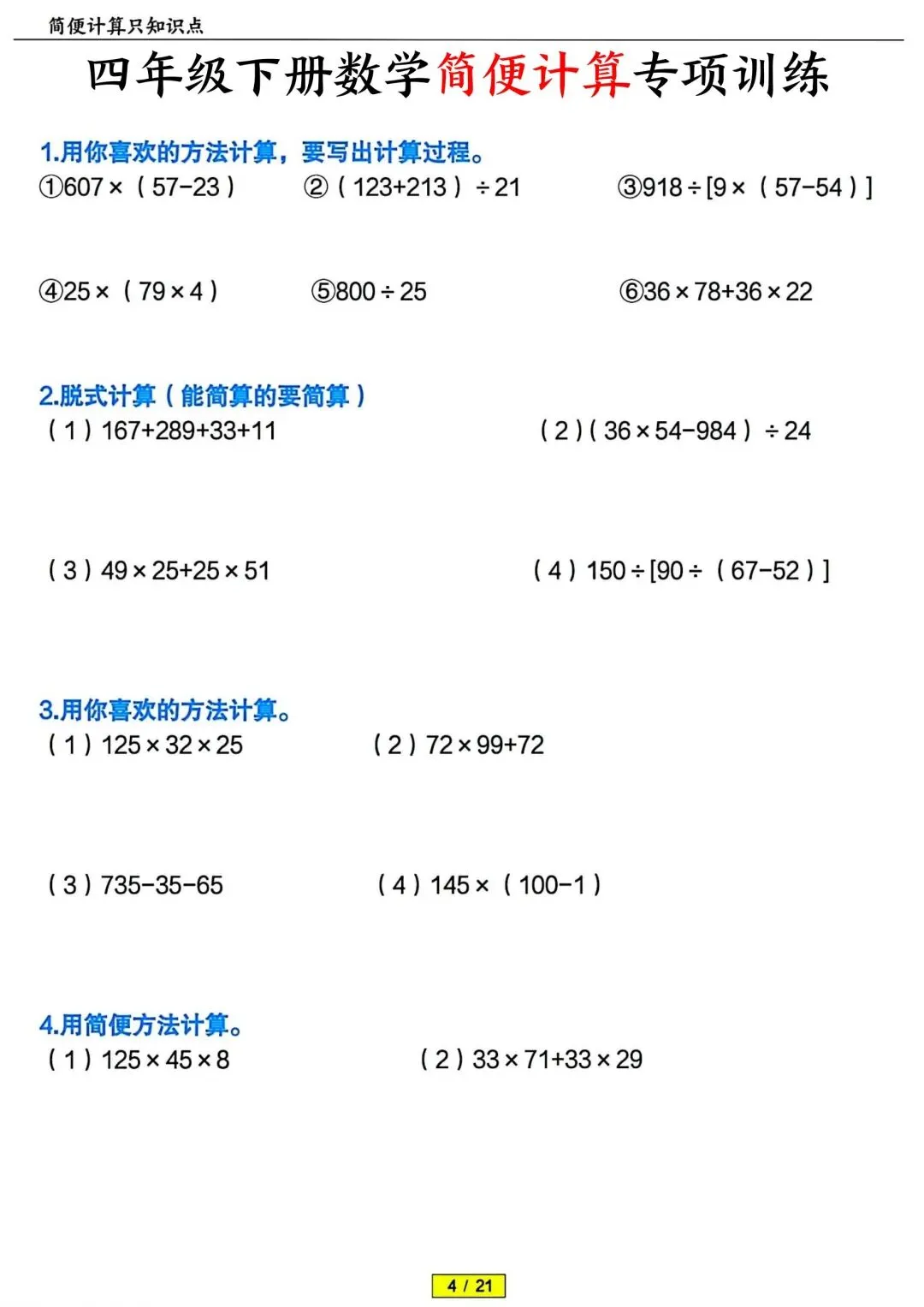 四年级下册数学简便计算专项训练 PDF电子版 四年级下册数学简便计算专项训练 PDF电子版,21页,带答案解析,老师整理的,内容全,题型丰富,题量充足,适合期末冲刺、平时练习、复习巩固用~ 领取完整电子版: ①:点一点右下角的“赞”和“在看”,感谢! ②:点击下方萌娃学习加油站,在公众号消息框发送:3321,即可免费领取