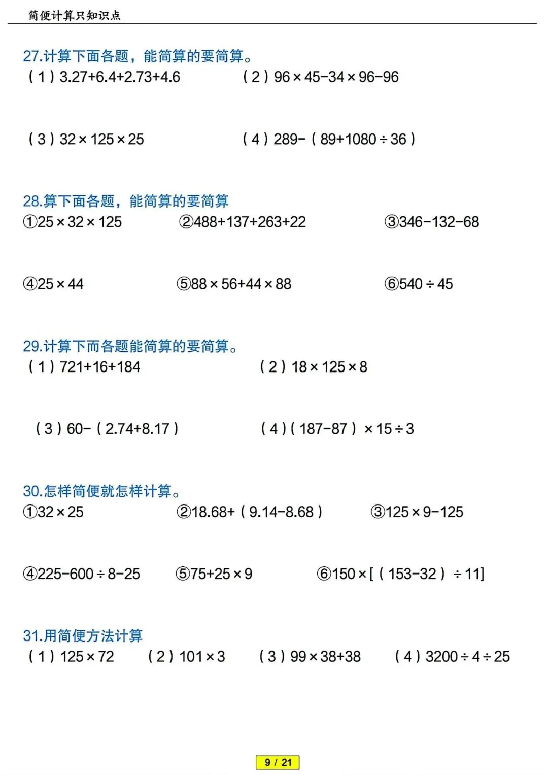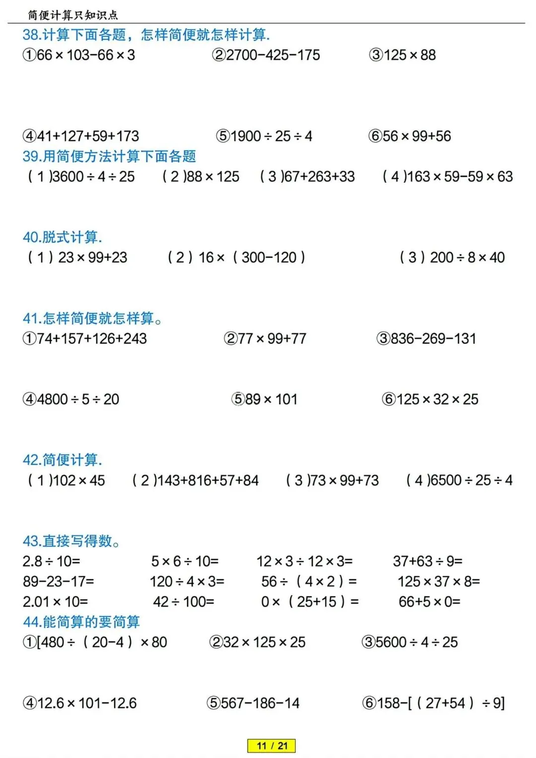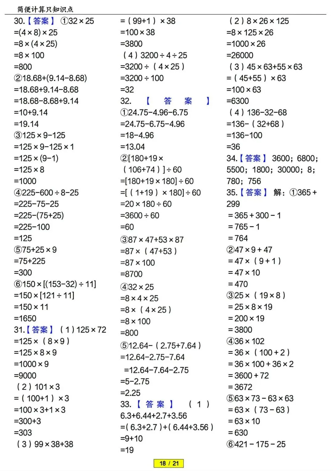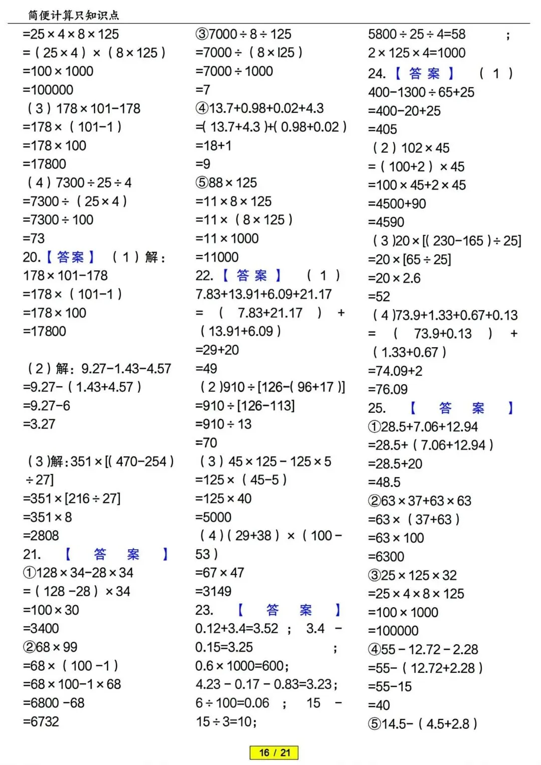 四年级下册数学简便计算专项训练 PDF电子版 四年级下册数学简便计算专项训练 PDF电子版,21页,带答案解析,老师整理的,内容全,题型丰富,题量充足,适合期末冲刺、平时练习、复习巩固用~ 领取完整电子版: ①:点一点右下角的“赞”和“在看”,感谢! ②:点击下方萌娃学习加油站,在公众号消息框发送:3321,即可免费领取