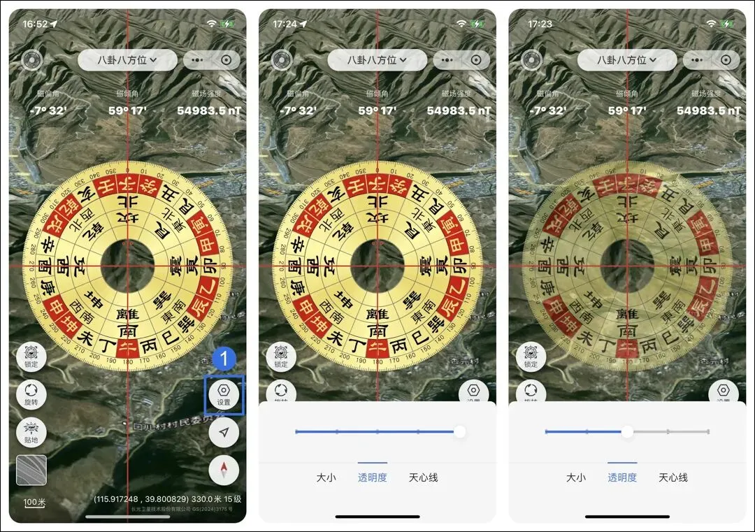 点击右下角【设置】图标,点击【透明度】,左右拖动来设置罗盘透明度。