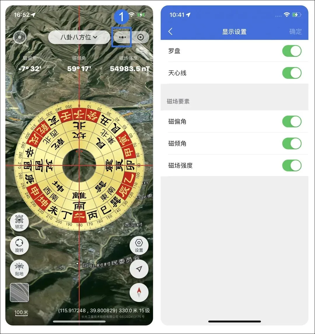 点击左上角更多按钮,进入显示设置界面,关闭选项,风水罗盘界面将不显示相关信息。