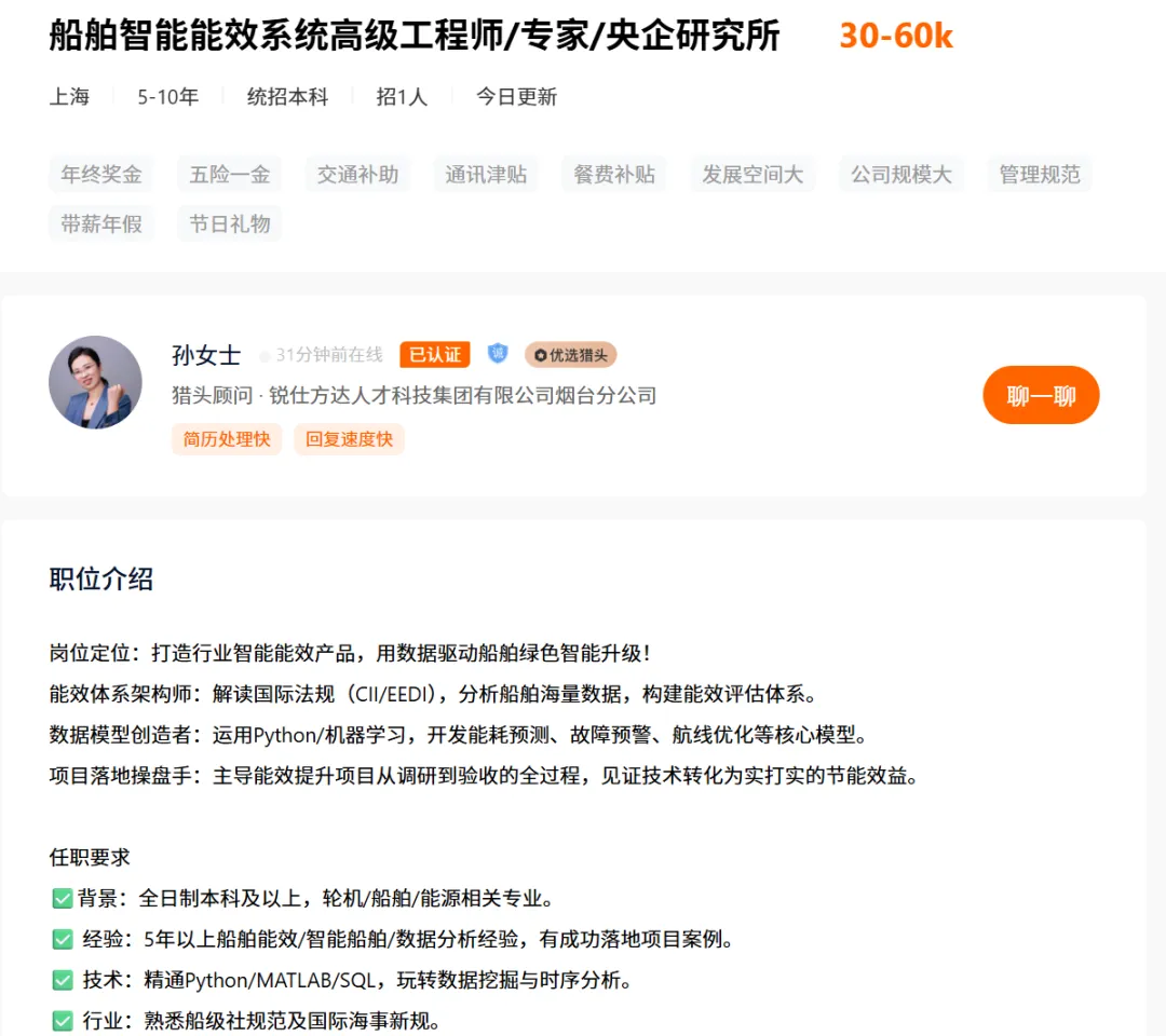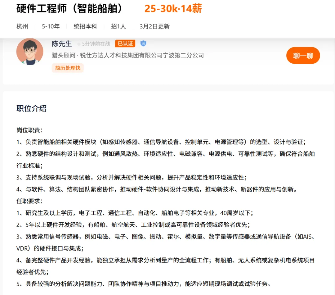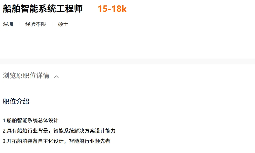 1.「天津滨海新区 船舶智能化解决方案工程师(具身智能架构方向)招聘」_2026年华海智汇技术有限公司招聘-智联招聘 2.【船舶智能系统工程师招聘】_2026深圳船舶智能系统工程师招聘信息-猎聘 ![]() 3.【上海 船舶智能能效系统高级工程师/专家/央企研究所招聘】-猎头顾问上海招聘信息-猎聘 ![]() 4.【杭州 硬件工程师(智能船舶)招聘】-猎头顾问杭州招聘信息-猎聘 ![]() |