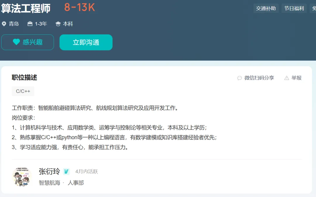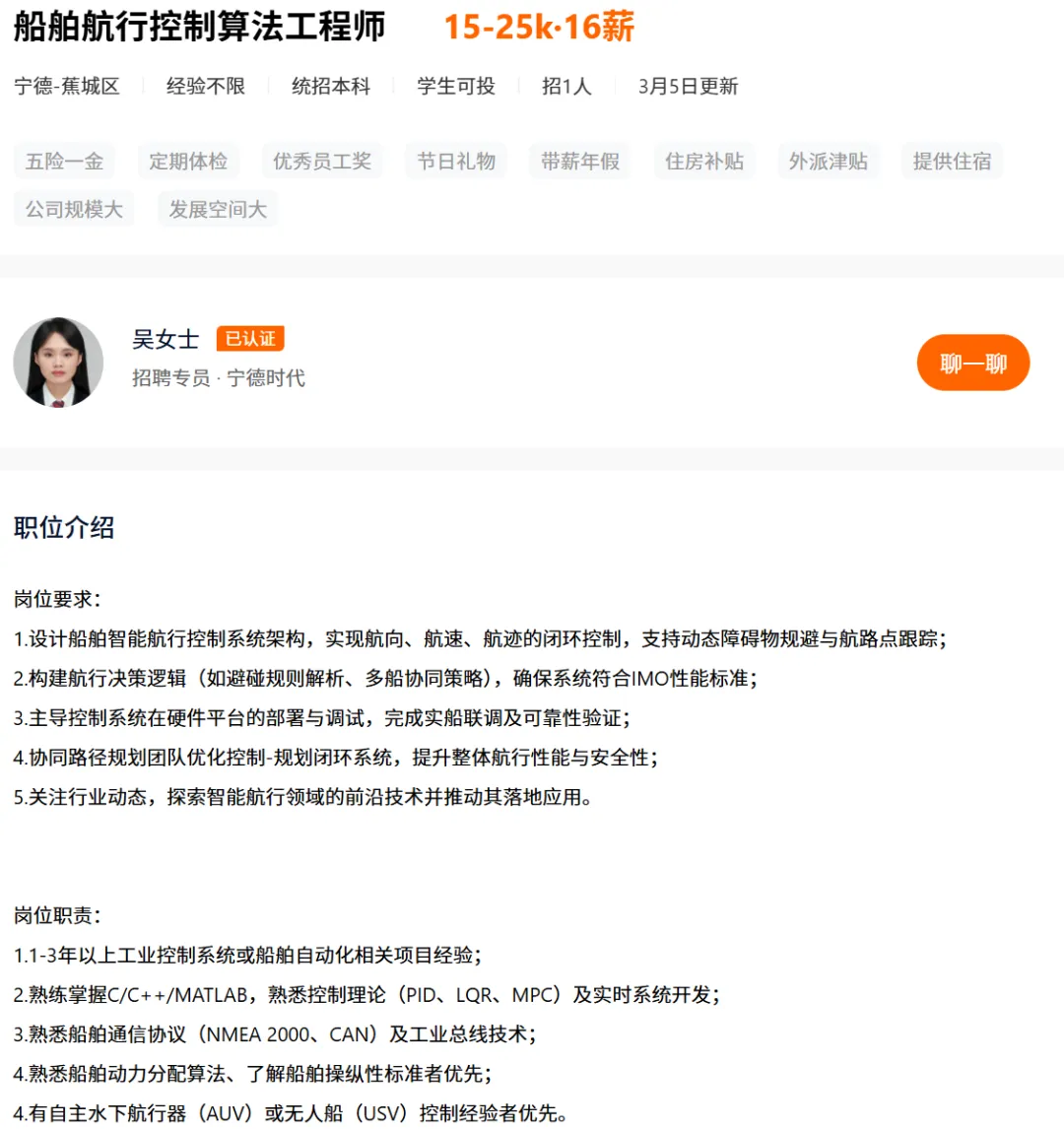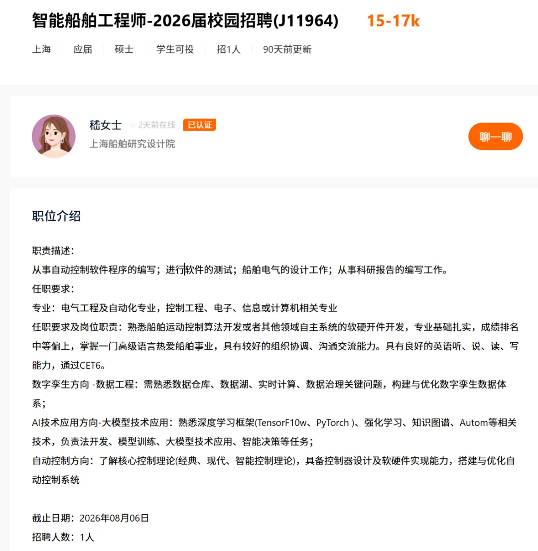 1.【上海 智能船舶工程师-2026届校园招聘(J11964)招聘】-上海船舶研究设计院上海招聘信息-猎聘 ![]() 2.【宁德 船舶航行控制算法工程师招聘】-宁德时代宁德招聘信息-猎聘 ![]() 3.【上海 智能船舶系统后端开发工程师(国央企+五险一金+双休)招聘】-猎头顾问上海招聘信息-猎聘 ![]() 4.「算法工程师招聘」_智慧航海招聘-BOSS直聘 ![]() |