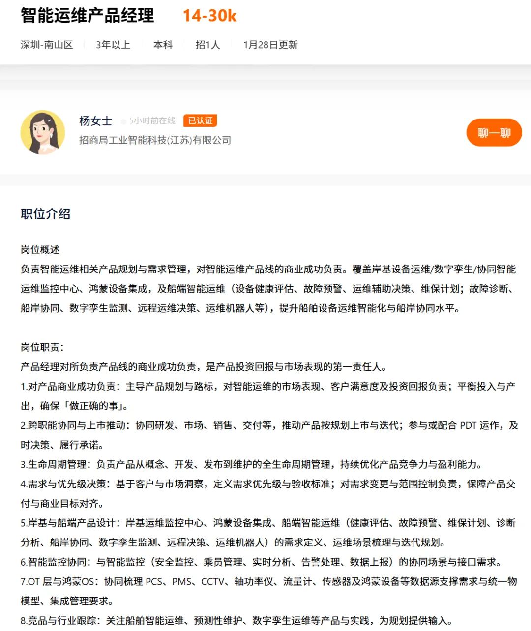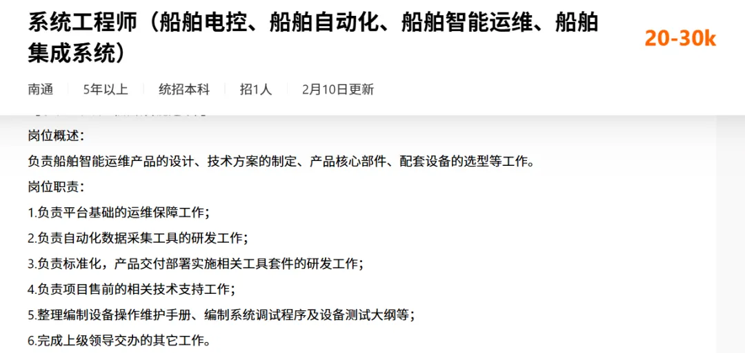 运维与技术服务类:船舶智能监控软件工程师、船舶智能化运维工程师