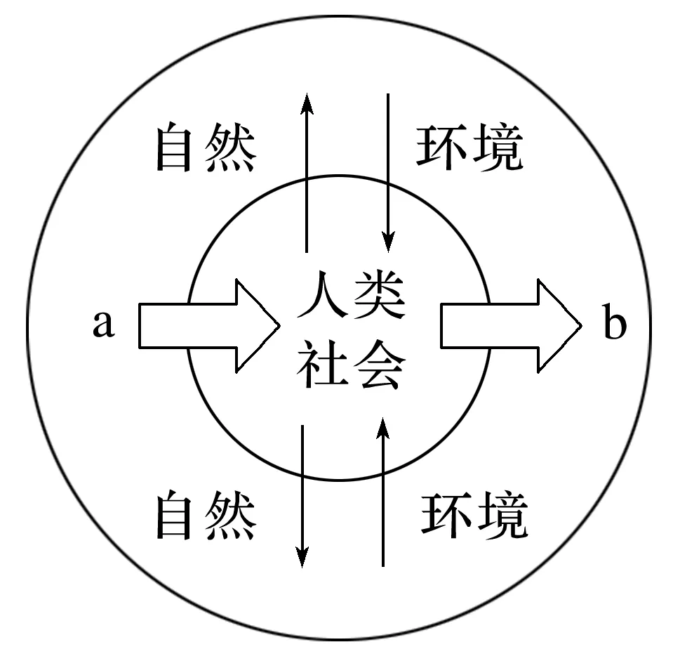 下图为“人类社会与环境的相关模式图”,图中箭头a表示人类通过生产活动从自然界中获取所需的资源。箭头b表示人类生产活动和消费活动产生的废弃物被排放到环境中。据此完成1~2题。