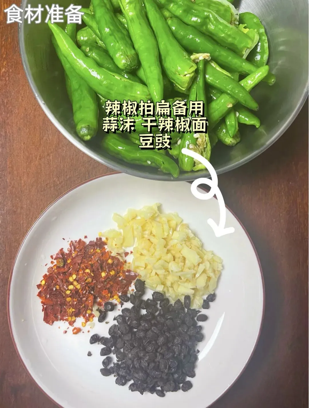 1. 处理辣椒:线椒洗净,去蒂后用刀背拍扁(方便入味和煎出虎皮),沥干水分。