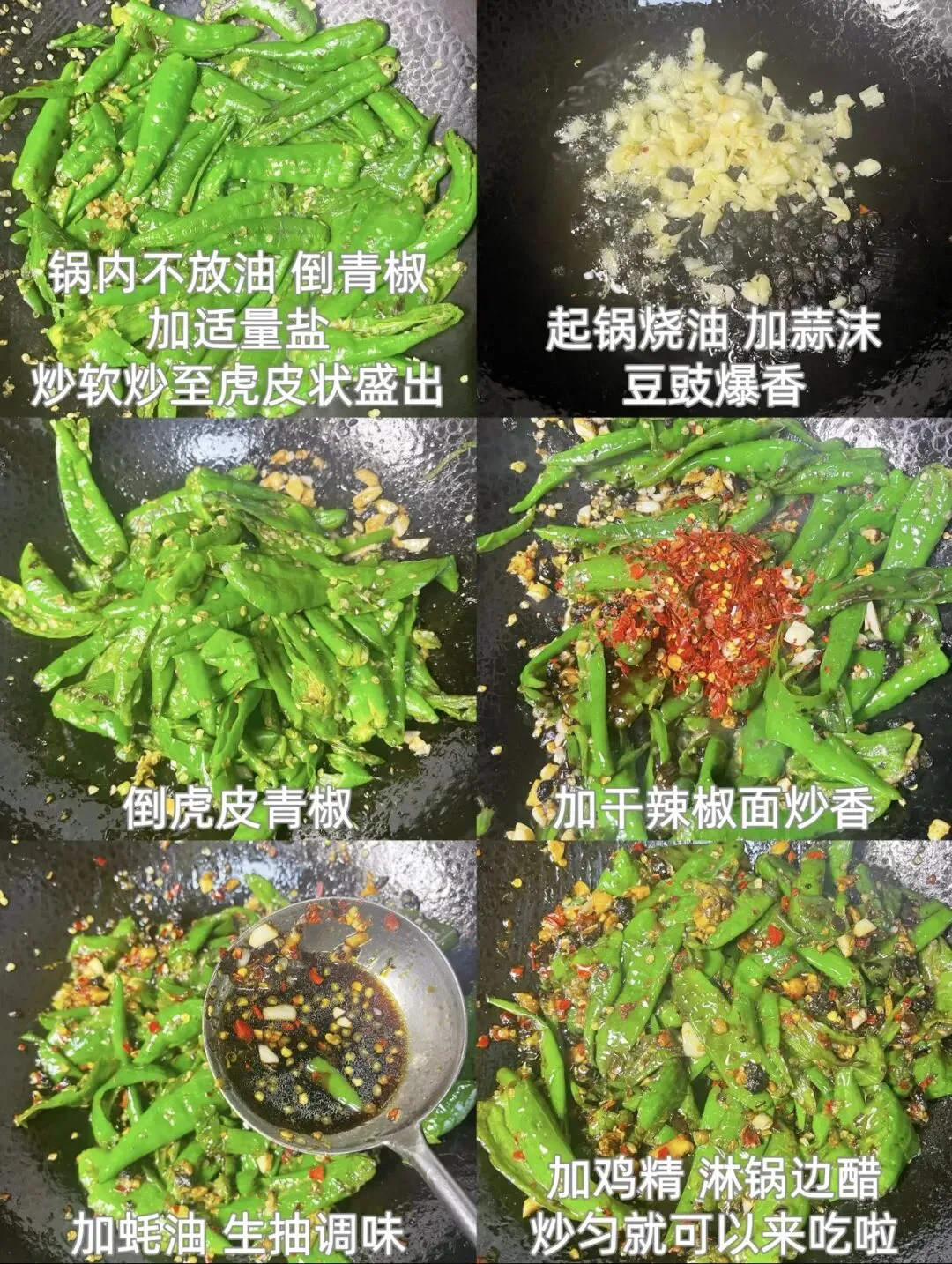 • 干煎是灵魂:先不放油干煎,能逼出辣椒的水汽,形成焦香虎皮,口感更脆爽。