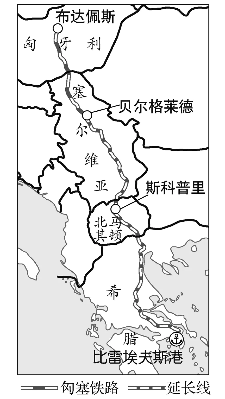 (2024·江西南昌期末)中欧陆海快线(下图)建成后,来自中国的海运货物抵达比雷埃夫斯港之后,可直接通过铁路转运至匈牙利等欧洲国家。得益于近年来的悉心经营,这条快线已成为中国对欧出口和欧洲商品进入中国的一条新的便捷通道。比雷埃夫斯港也在衰败了多年后一跃成为世界主要大港。读图完成3~4题。