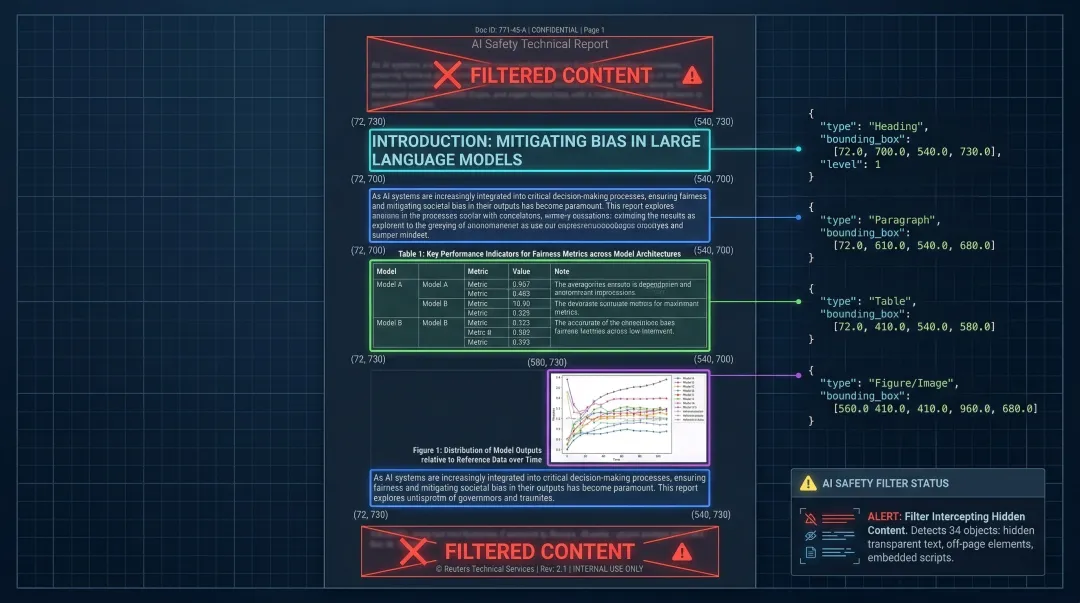 干净。 页眉页脚、隐藏水印、透明文字,这些噪音不该出现在LLM的上下文窗口里。尤其是隐藏的Prompt注入攻击——有人会在PDF里埋不可见文字来劫持你的模型,这个威胁是真实存在的。