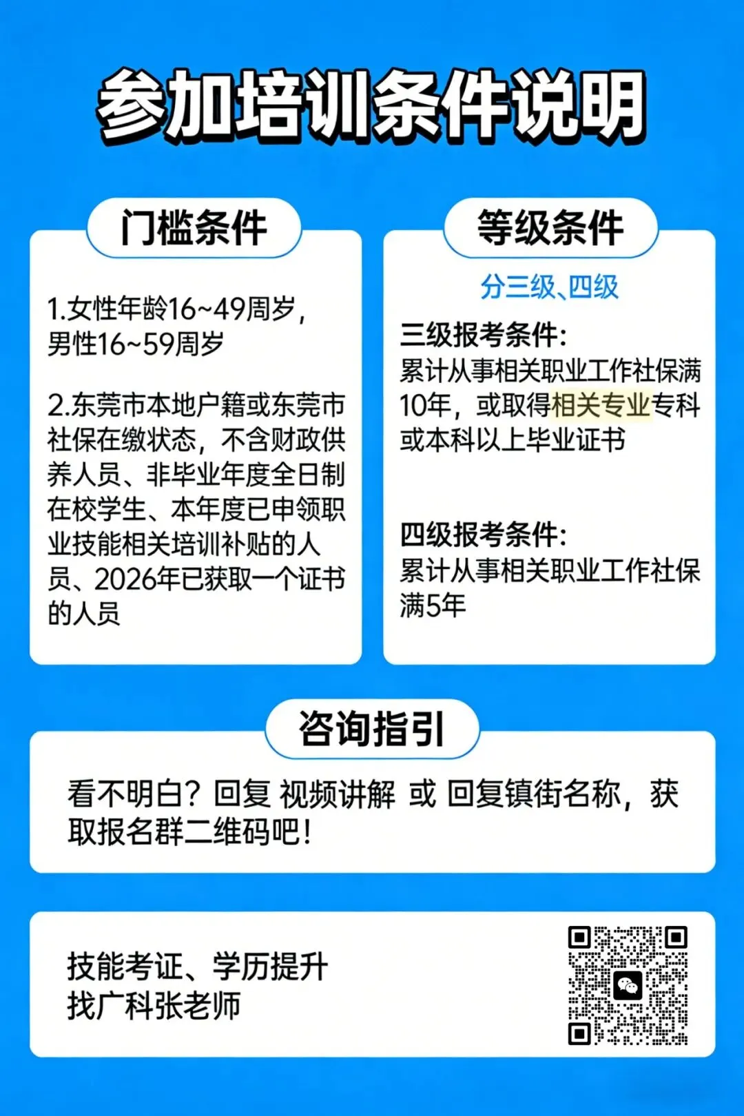 报考四级证书条件:年龄(女16-49岁,男16-59岁)+ 东莞社保或东莞户籍 + 相关工作5年社保。