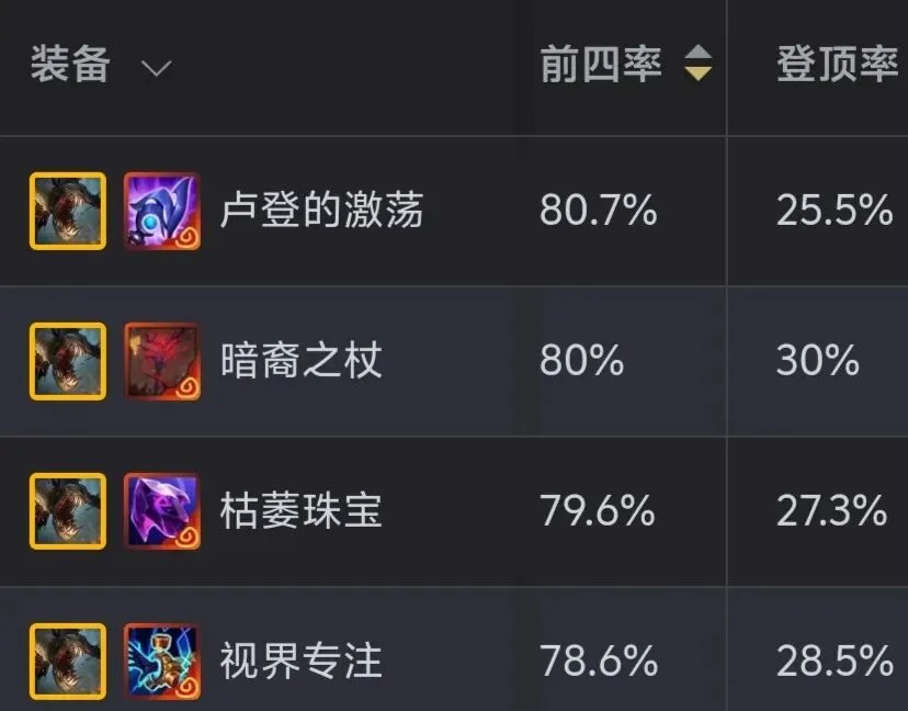 金铲铲大数据显示携带卢登的激荡的稻草人前四率80.7%,登顶率25.5%。前四率是所有神器中最高的,就是登顶率略低于枯萎珠宝可能是利用技能大范围减少敌人魔抗的缘故吧。但是这个游戏的最重点保四争一,只有前四才会有分才能登顶王者,并不是一味的登顶才能冲上最强王者。
