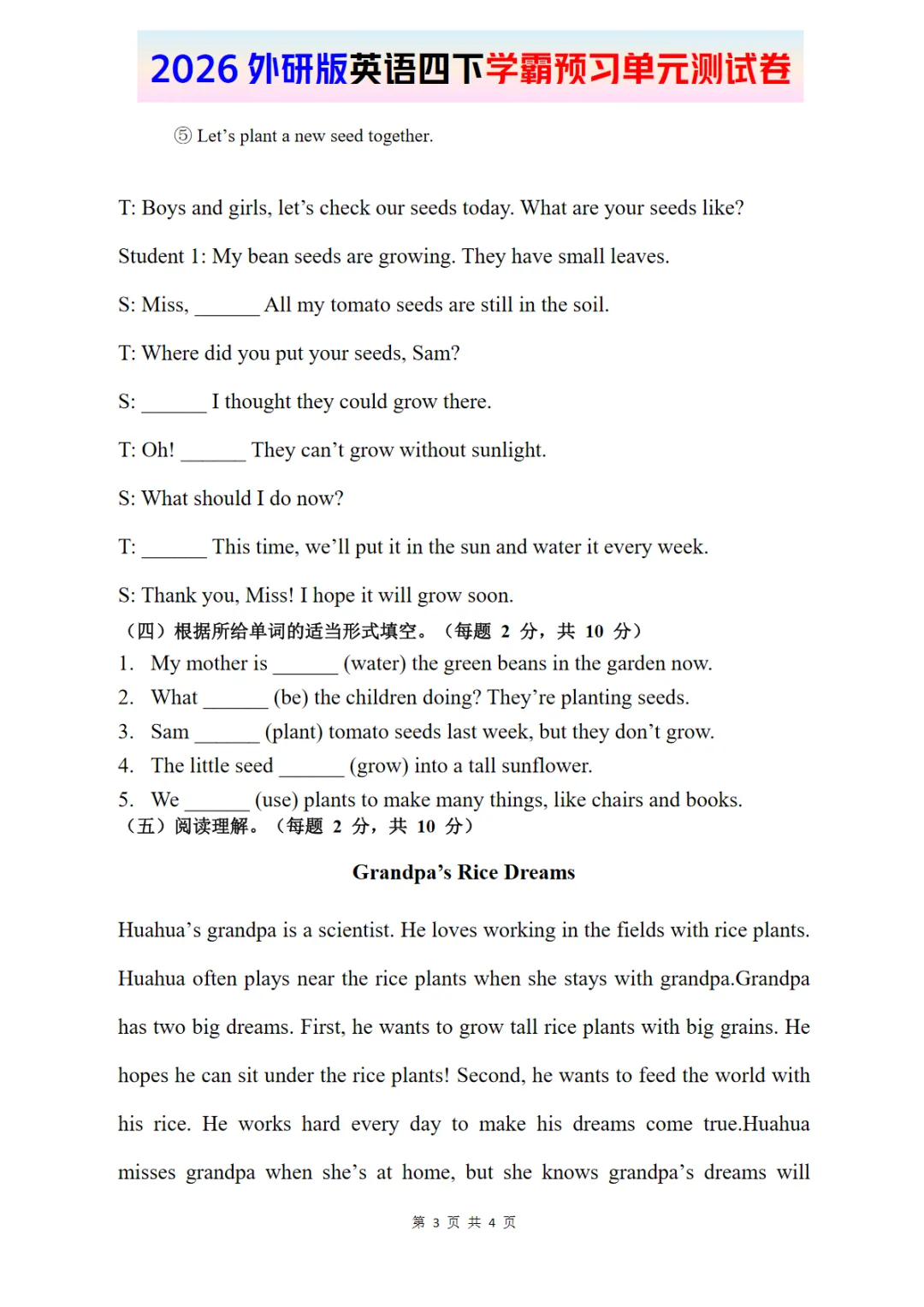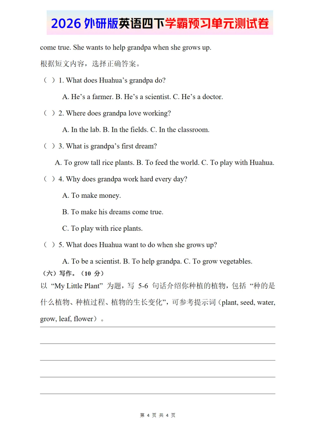 【免费下载】四年级(下)英语 Unit 4 测试卷《外研版(三起)》,PDF电子版,可打印