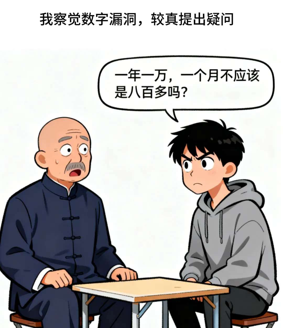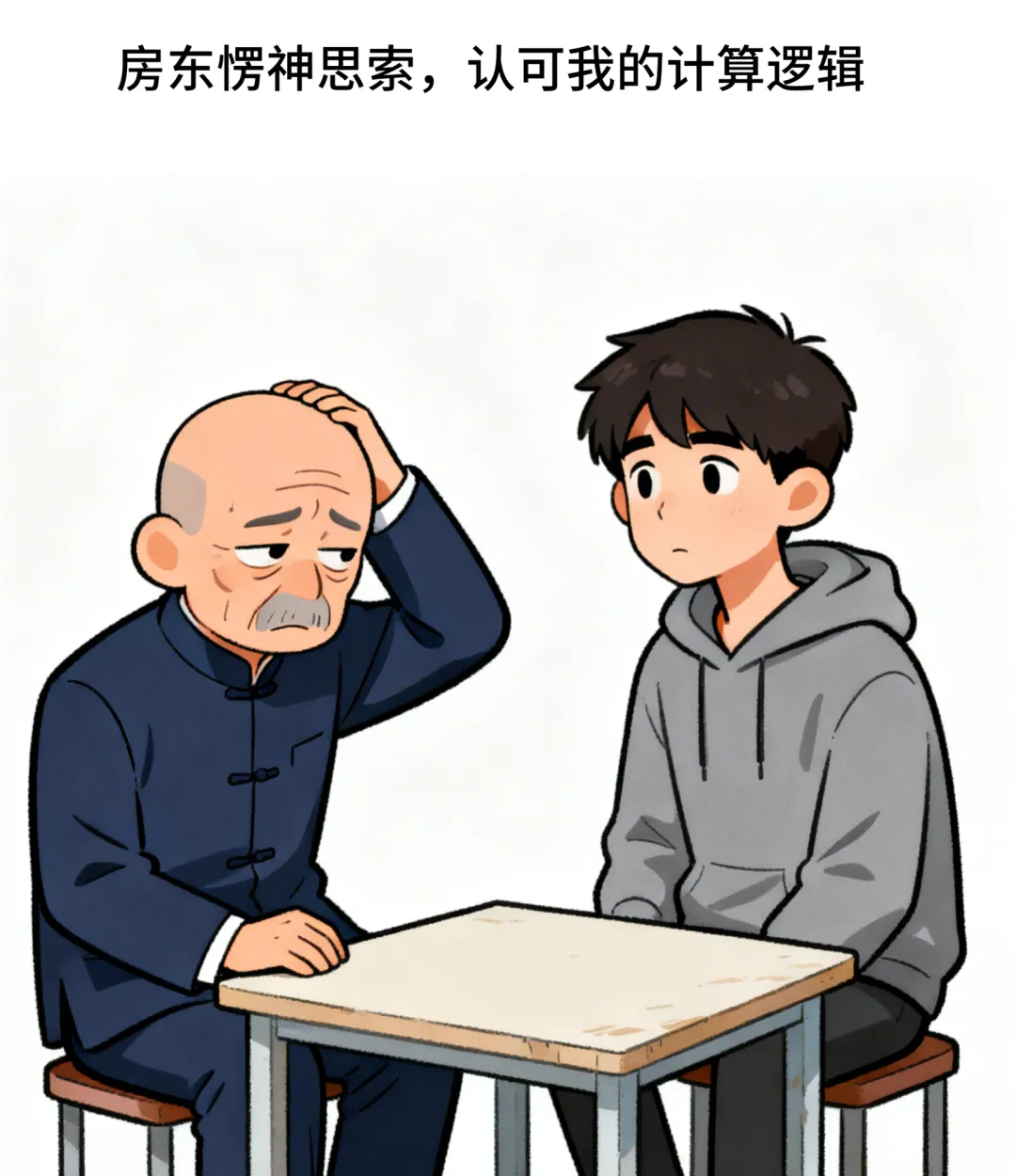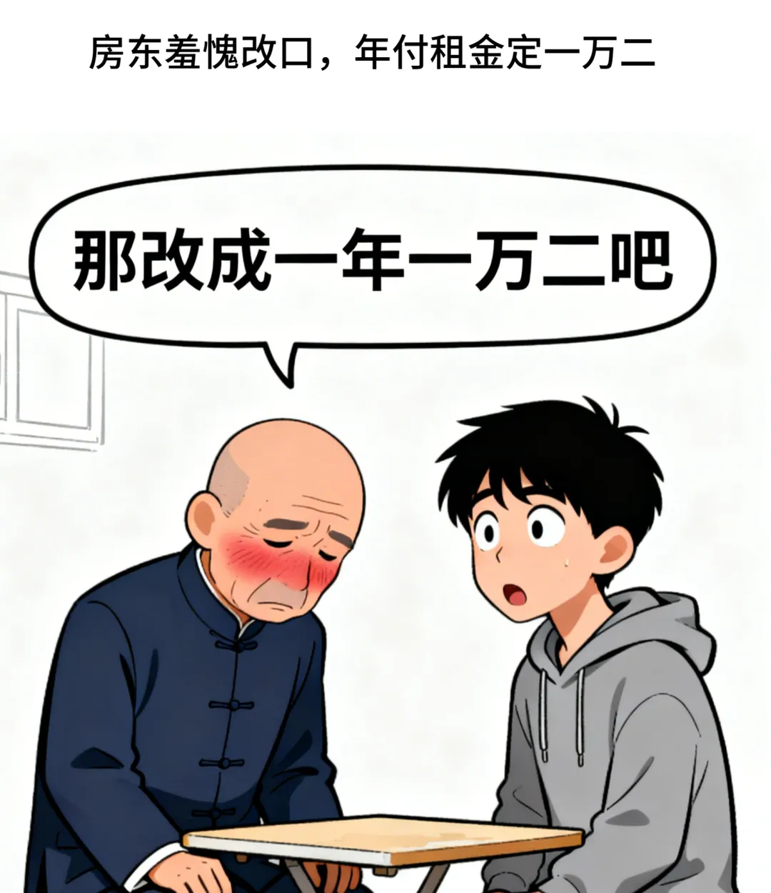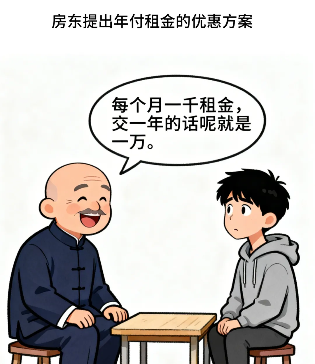 趣味漫画:房东说:每个月一千租金,交一年就是一万.我反问:一年一万,一个月不该是八百多吗?房东:……
