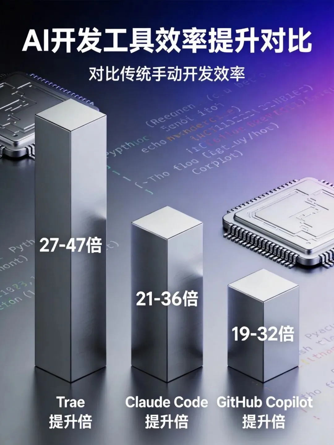 AI工具效率对比图:Trae、Claude Code、GitHub Copilot相比传统开发的效率提升倍数对比