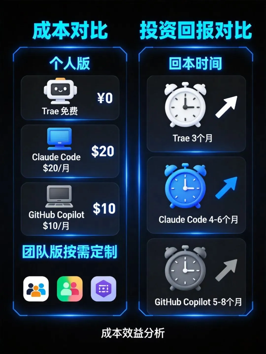 成本效益分析图:三款工具的成本对比与投资回报时间分析