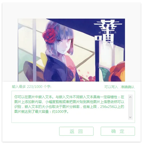 ;嵌入文本有容错性,图片小幅编辑后信息仍可识别,容量也和分辨率相关,256×256及以上图片可达到约1000字的最大容量