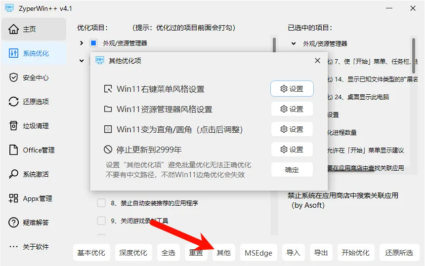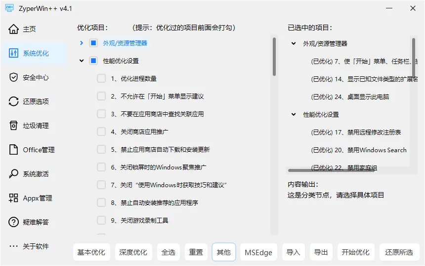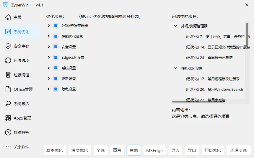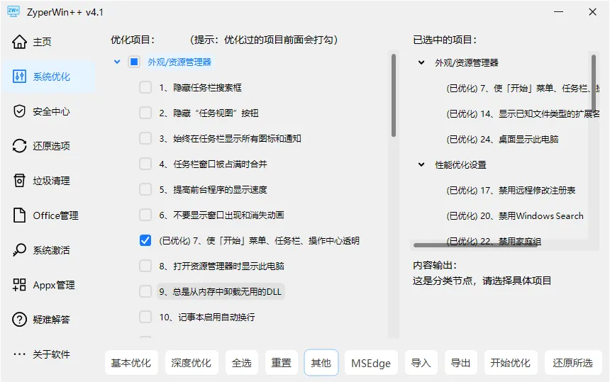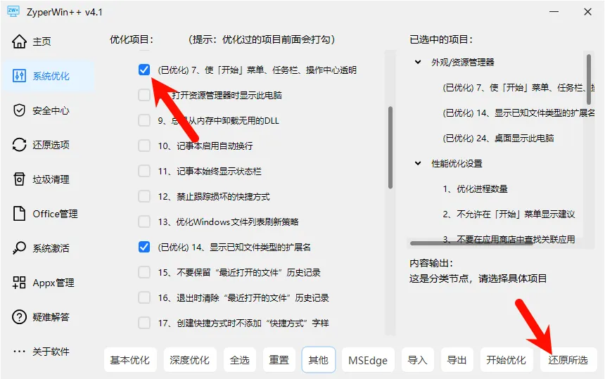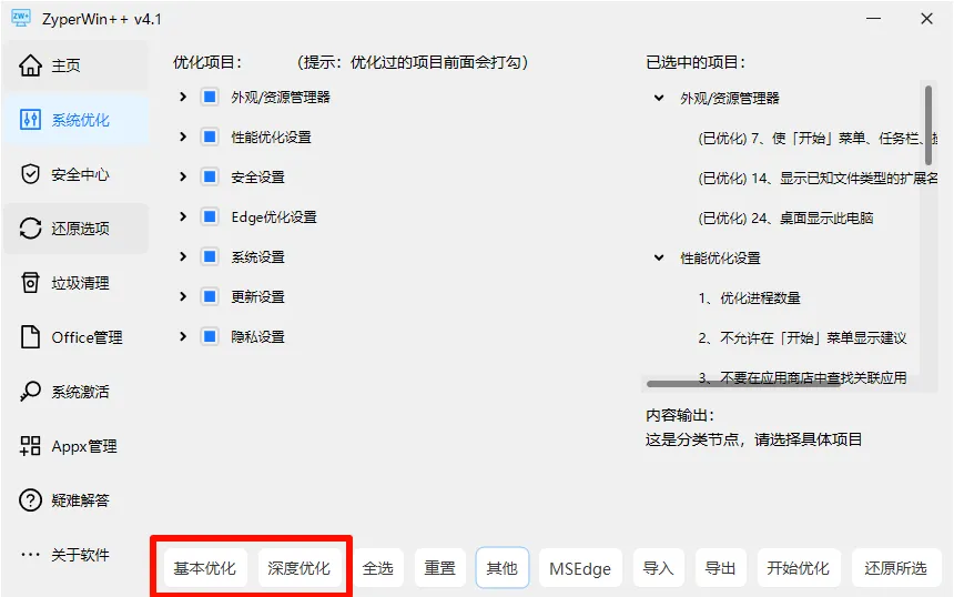 支持”基本优化”和”深度优化”一键批量处理,误操作也可随时还原。