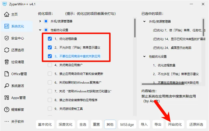 操作极简:勾选所需项目,点击右下角”开始优化”即可。