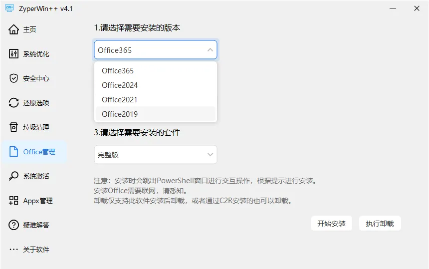 一键禁用 Windows安全中心,一键清理 系统垃圾(含三大类别,多项细分),一键安装 Office 2019-2024及Office 365,一键激活 Windows系统及Office软件。