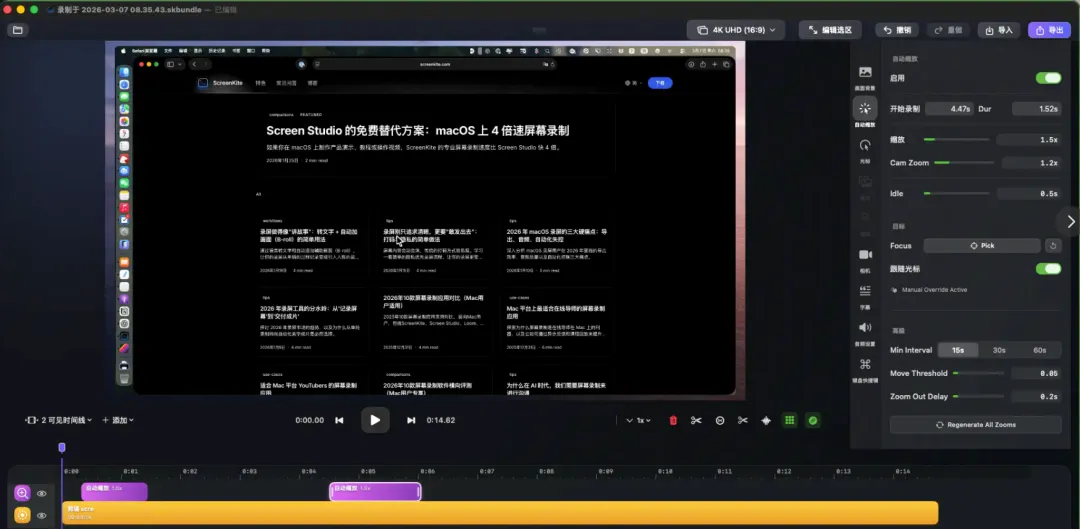 它最大的特色是 自动聚焦和智能缩放:当你点击鼠标或进行操作时,画面会自动放大关键区域,让观众一眼看懂你在做什么。