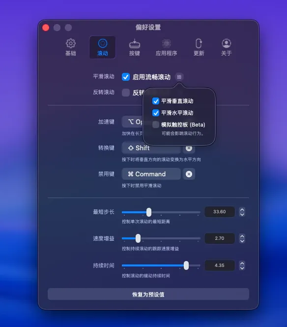 Mos 是一款开源工具,可以深度调节鼠标滚动行为,例如: