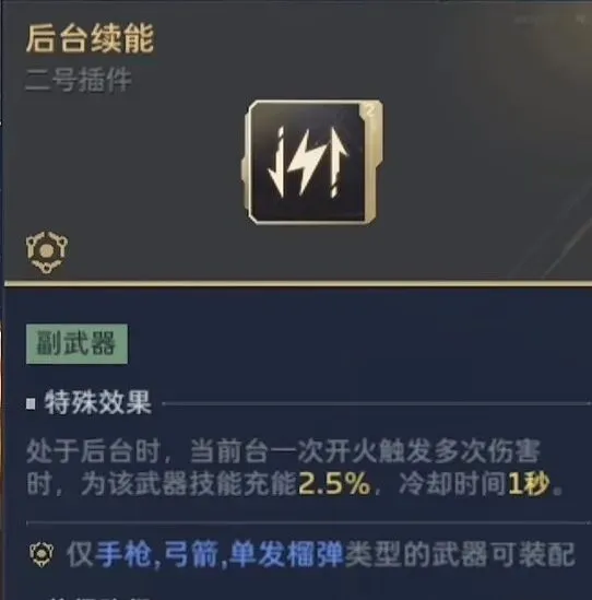 3. 副武器插件搭配:一号位后台补弹,二号位后台续能,三号位联动提升,四号位烈焰冲击。