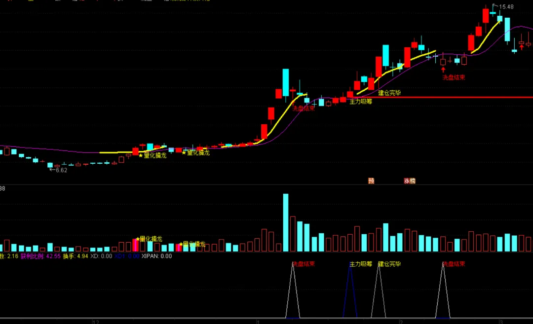 DRAWTEXT(XD1,0.96,’主力吸筹’),COLORYELLOW;