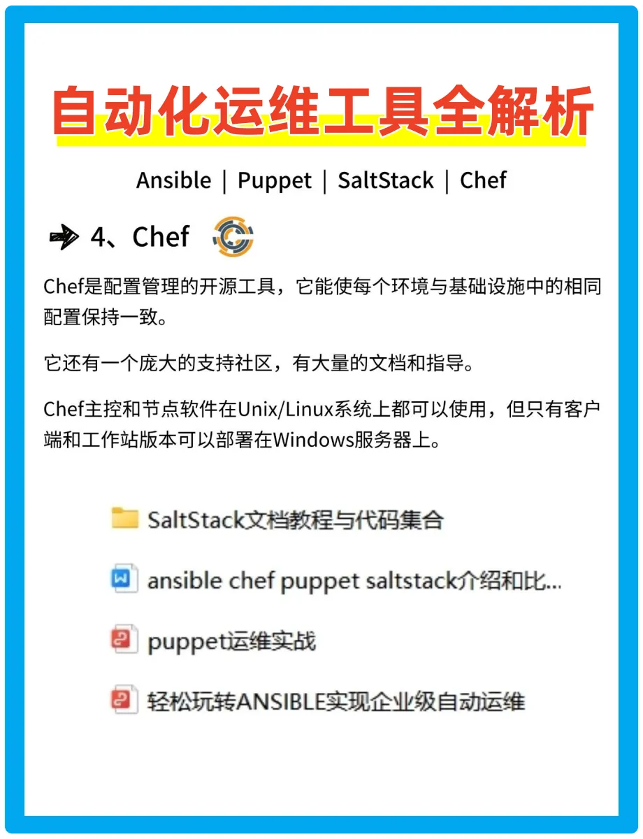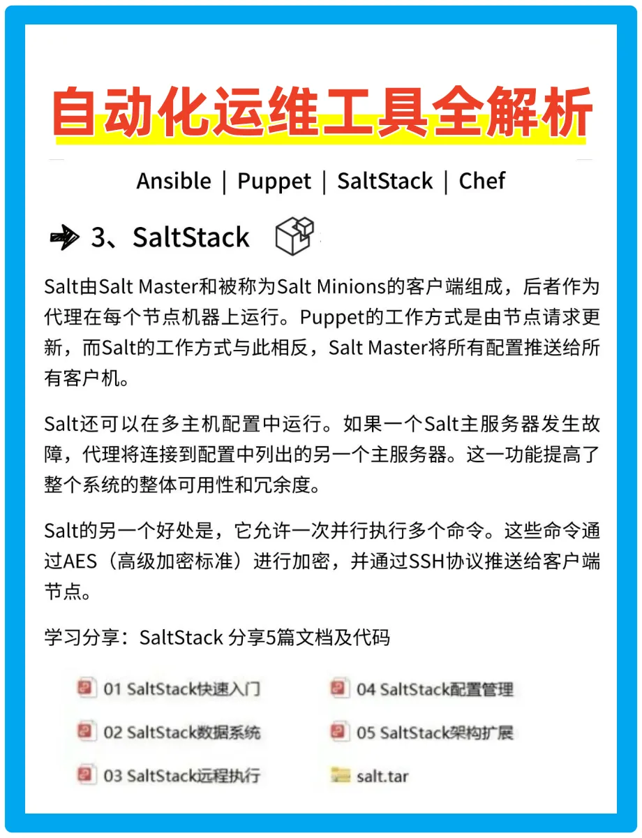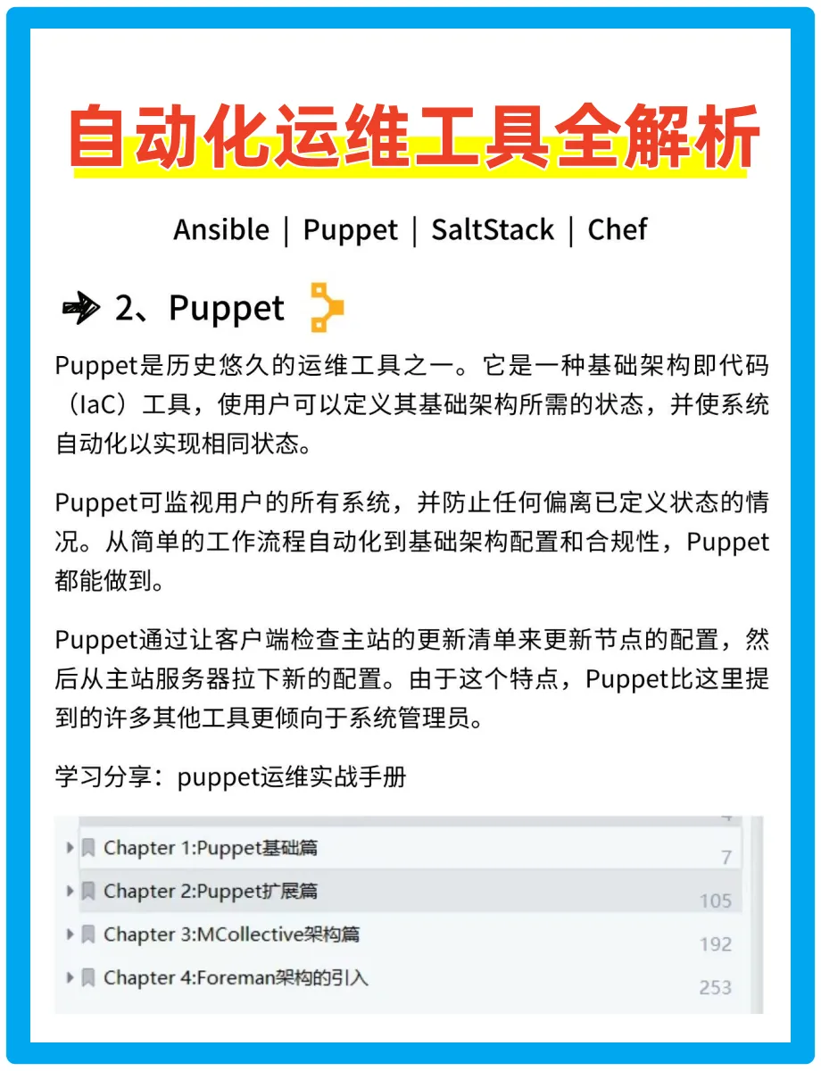 今天给大家分享4个常见的自动化运维工具——Ansible、Puppet、SaltStack、Chef。