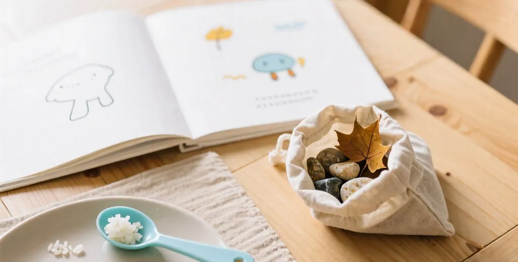有一回,我特地带了一只小布袋,娃一路“收集”,回家蹲地上把它们都倒出来玩。他兴奋拍着手笑个不停,看着就安心。