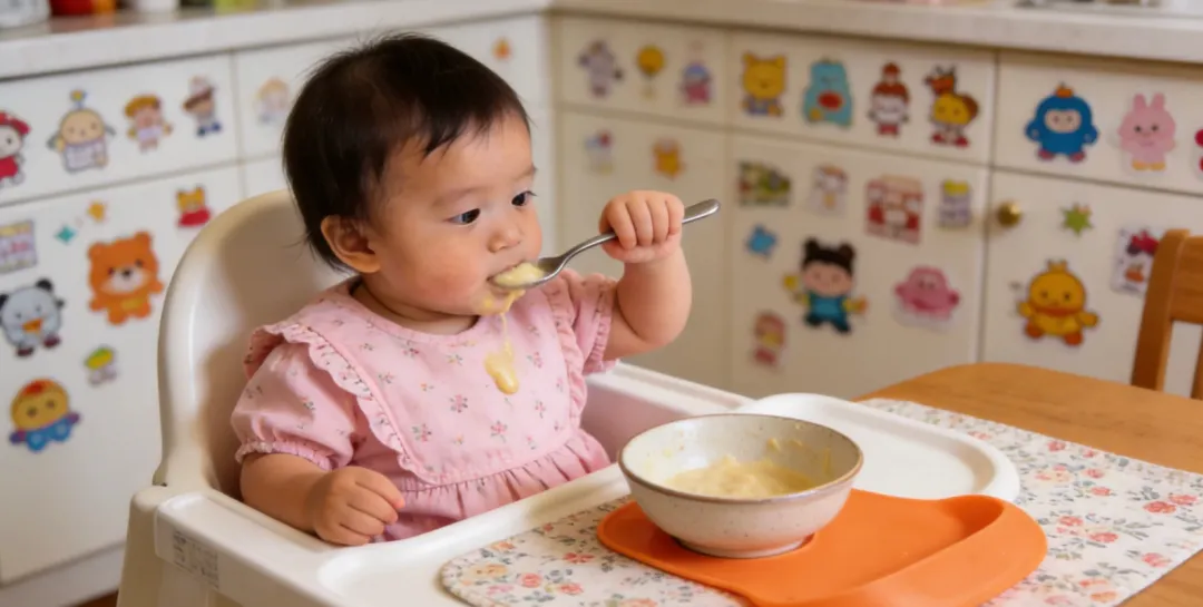 不到2分钟,小胖墩已经自己晃到饭桌旁,把勺子抓在手里,奶声奶气地来一句:“我自己吃!”