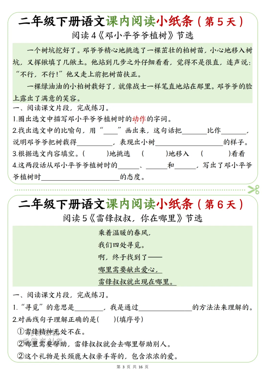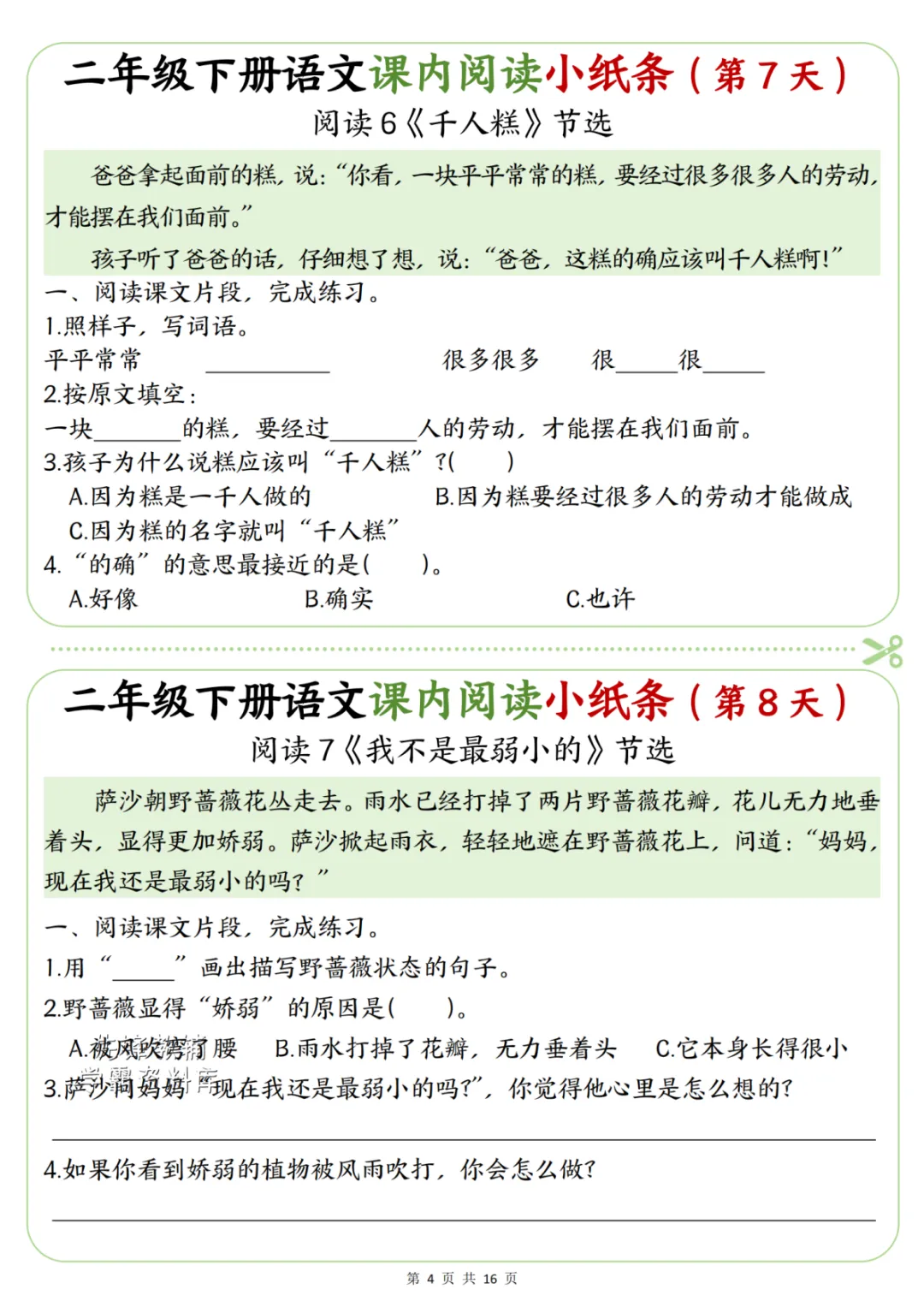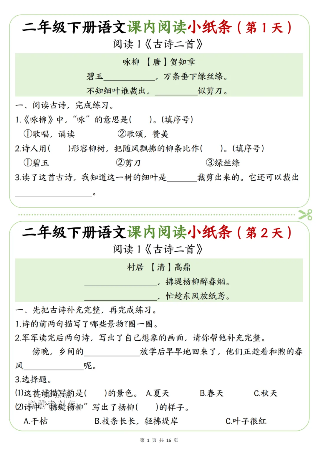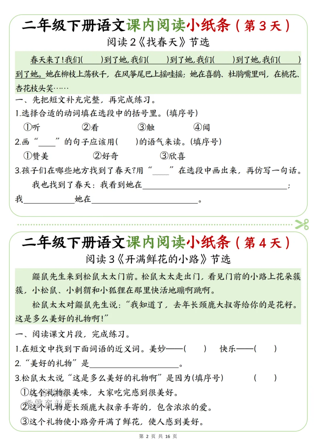 2026春二年级下册语文课内阅读小纸条电子版可打印