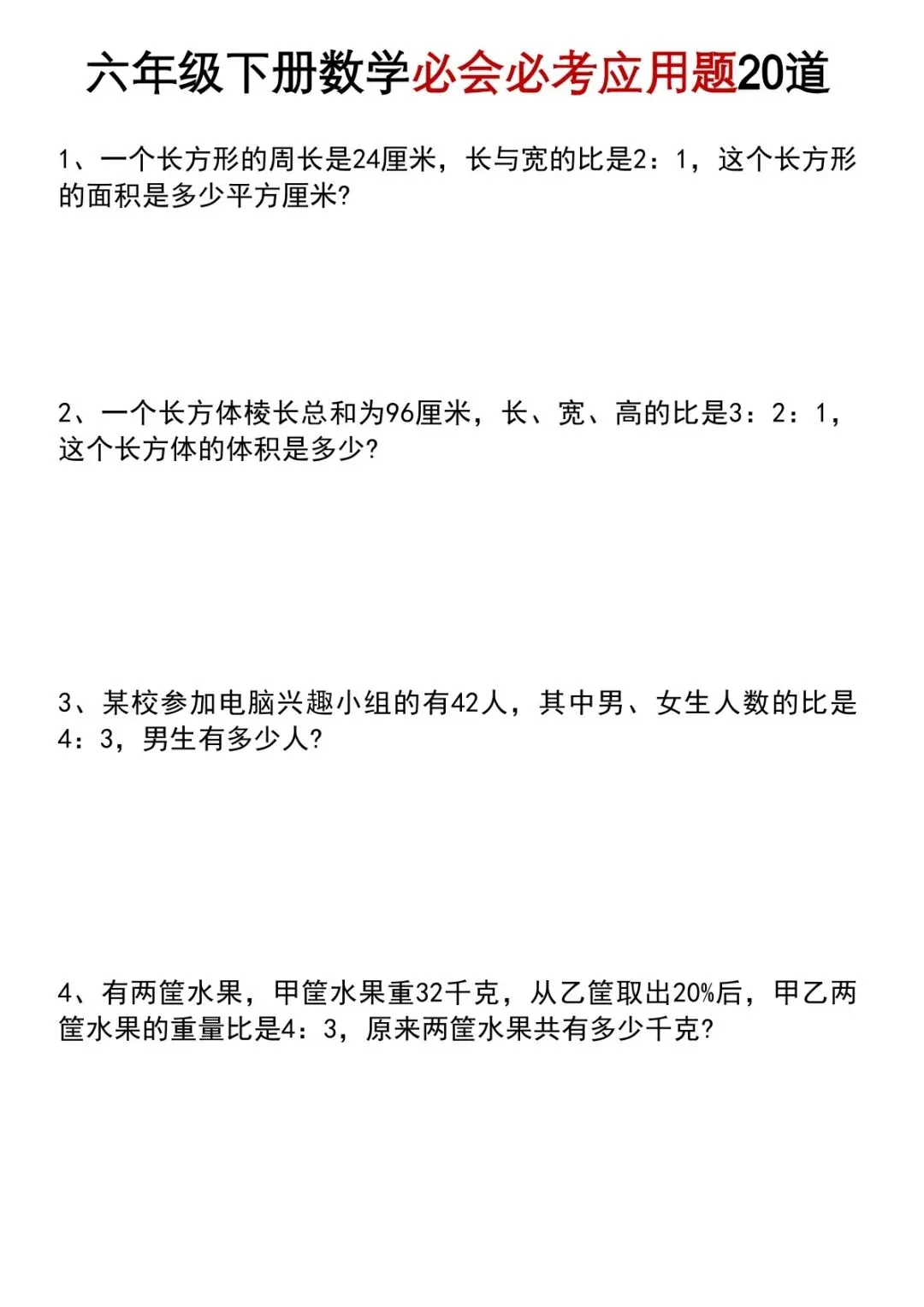 可下载丨26春六年级下册数学小升初必会必考应用题20道,电子版可打印