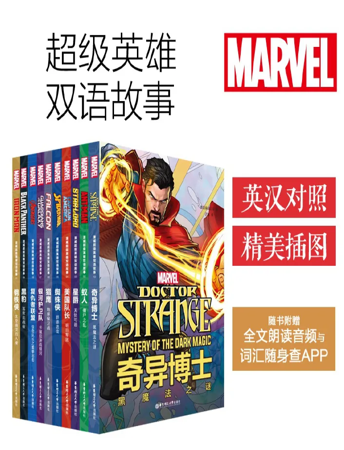 这套由华东理工大学出版社出版的漫威超级英雄双语故事集,是专为漫威粉丝与英语学习者打造的沉浸式阅读套装,以 “英汉对照 + 配套资源” 为核心亮点,既保留漫威故事的热血内核,又兼顾语言学习的实用性,电子版延续了纸质书的核心优势,更添阅读便捷性。