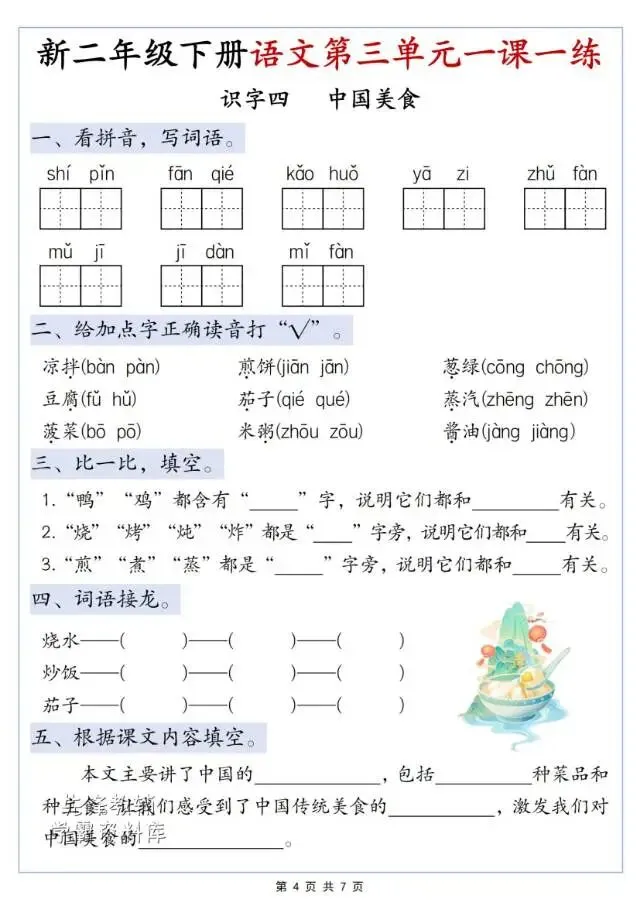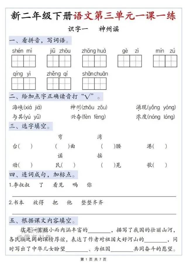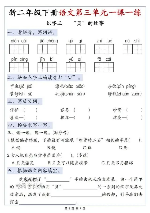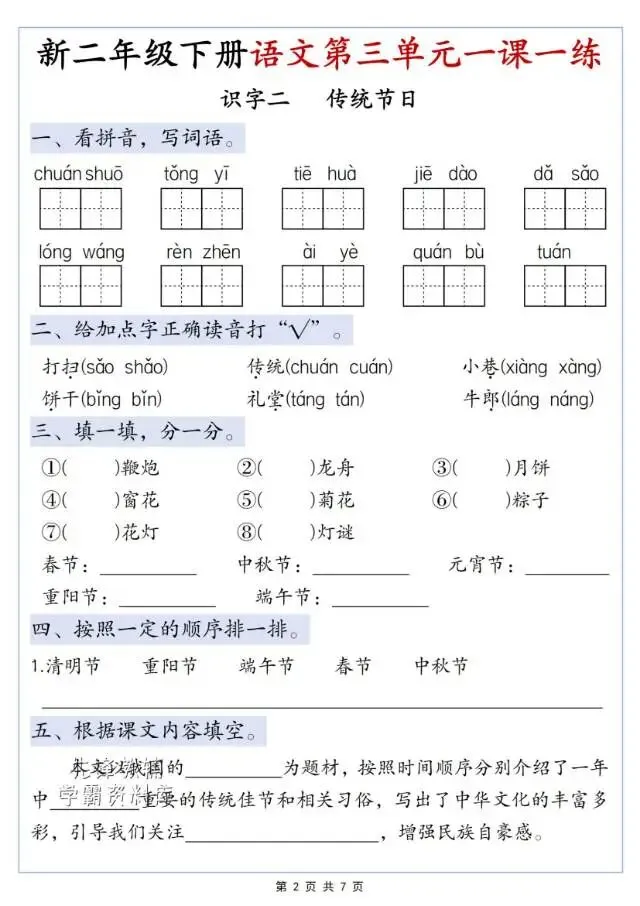 26新《二年级下册语文第三单元一课一练》电子版可打印