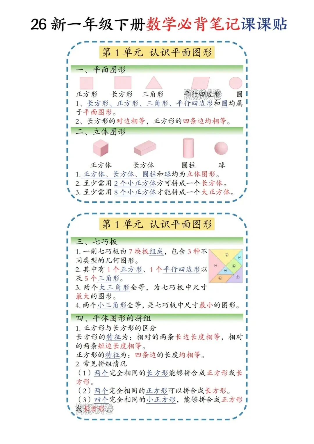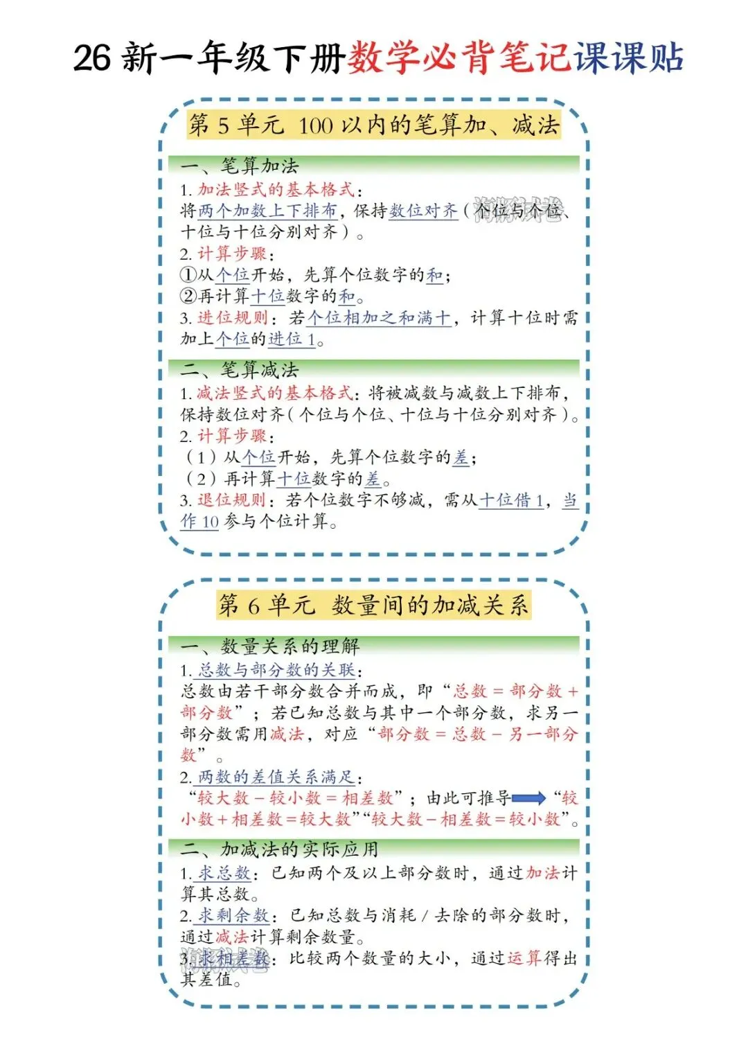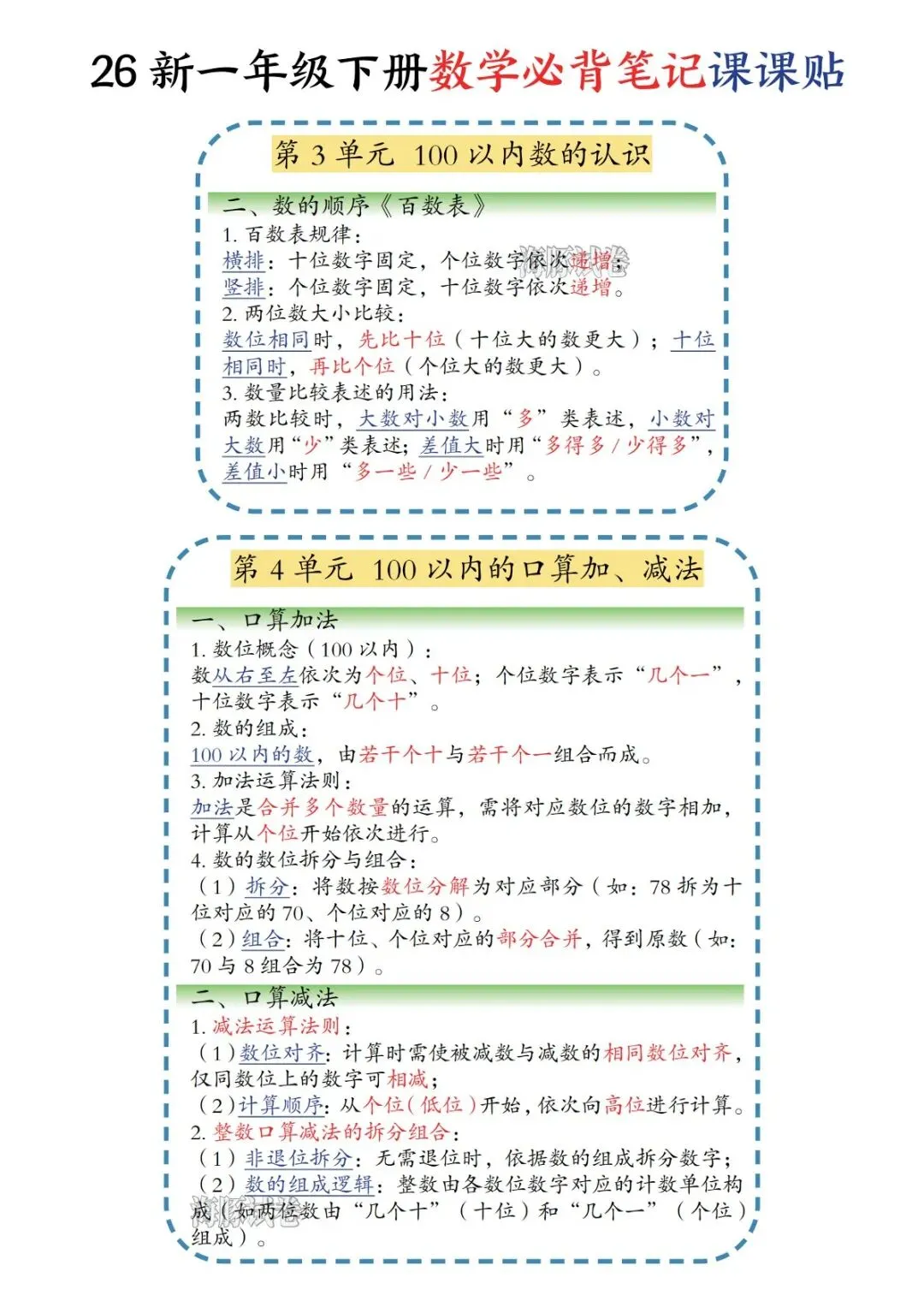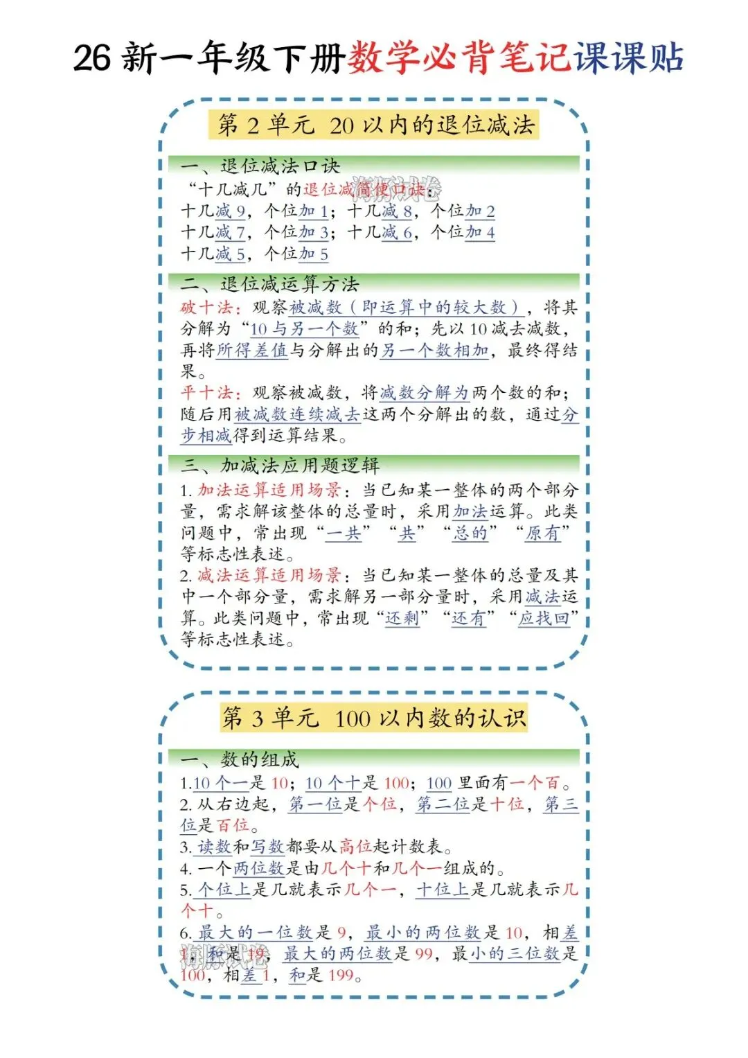 一年级下册数学必背笔记课课贴(电子版可打印)