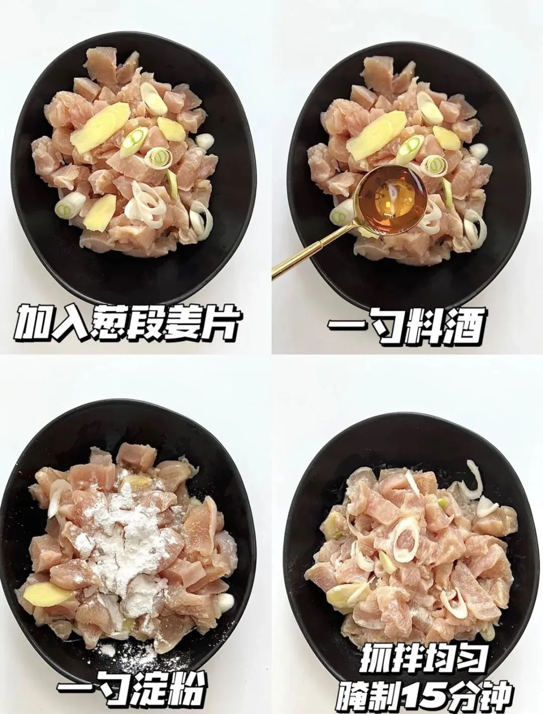 1⃣️鸡胸肉切小块,加葱姜蒜➕一勺料酒➕一勺淀粉抓拌均匀腌制15分钟。