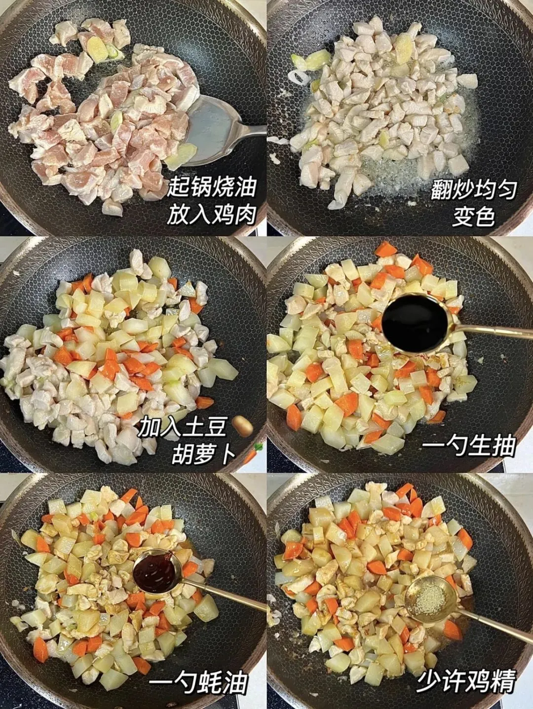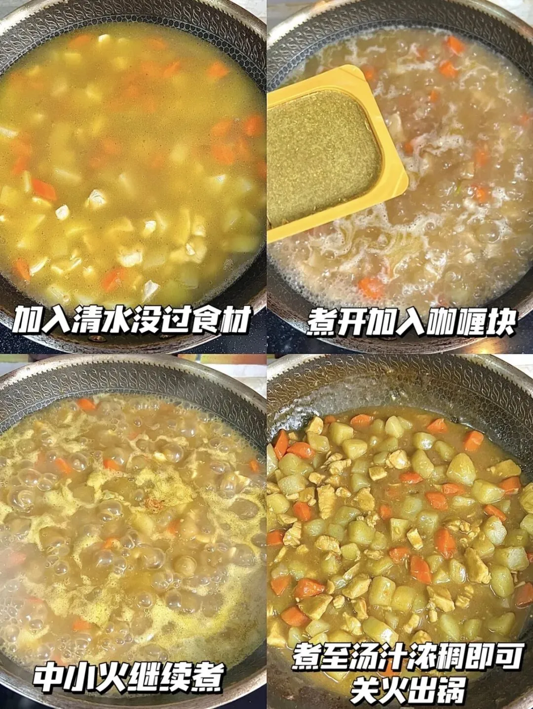 3⃣️起锅热油下鸡肉,炒至变色加入士豆丁胡萝卜丁翻炒后➕一勺生抽➕一勺蚝油➕少许鸡精翻炒均匀然后加入没过食材的清水,大火煮开,加入咖喱块,中小火煮至汤汁浓稠即可关火。