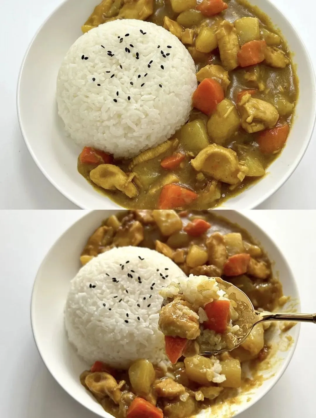 4⃣️盛一碗米饭,倒扣在盘子里,放几粒熟黑芝麻然后把煮好的咖喱鸡肉盛到盘子里,拌一拌米饭就可以开吃啦!手残党 懒人必备!自己一个人不知道吃什么的时候强烈推荐 五颗星🌟🌟🌟🌟
