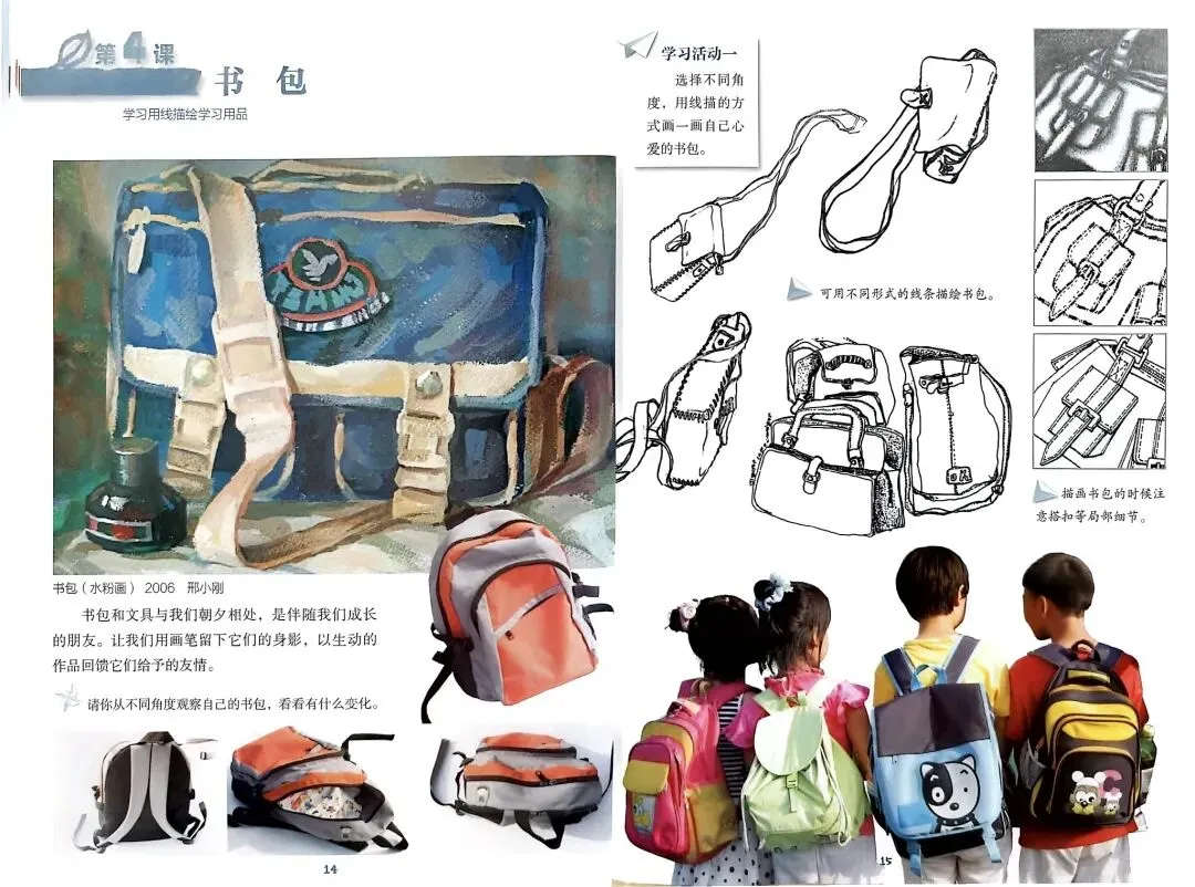 1.学习“整体—局部”的观察与绘画原则,用线条表现书包的结构特征。