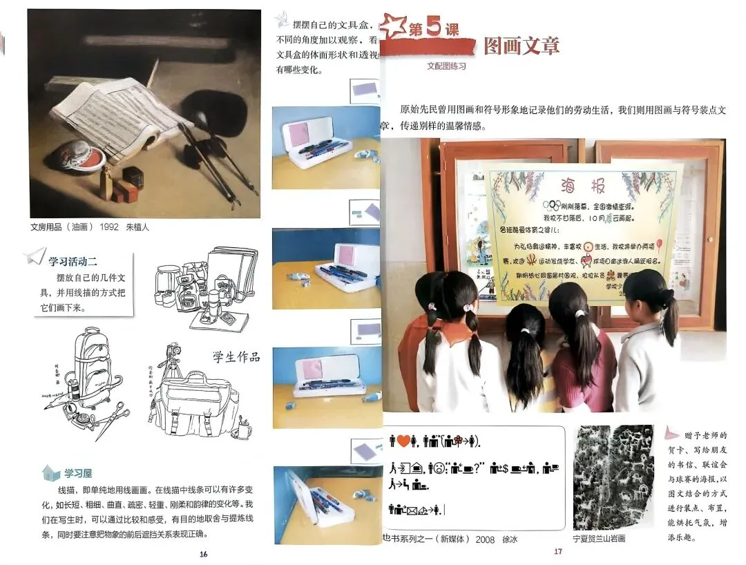 2.以文具作为表现对象,能运用已有的静物构图经验进行文具配置摆放,并用线描的方式画下来。