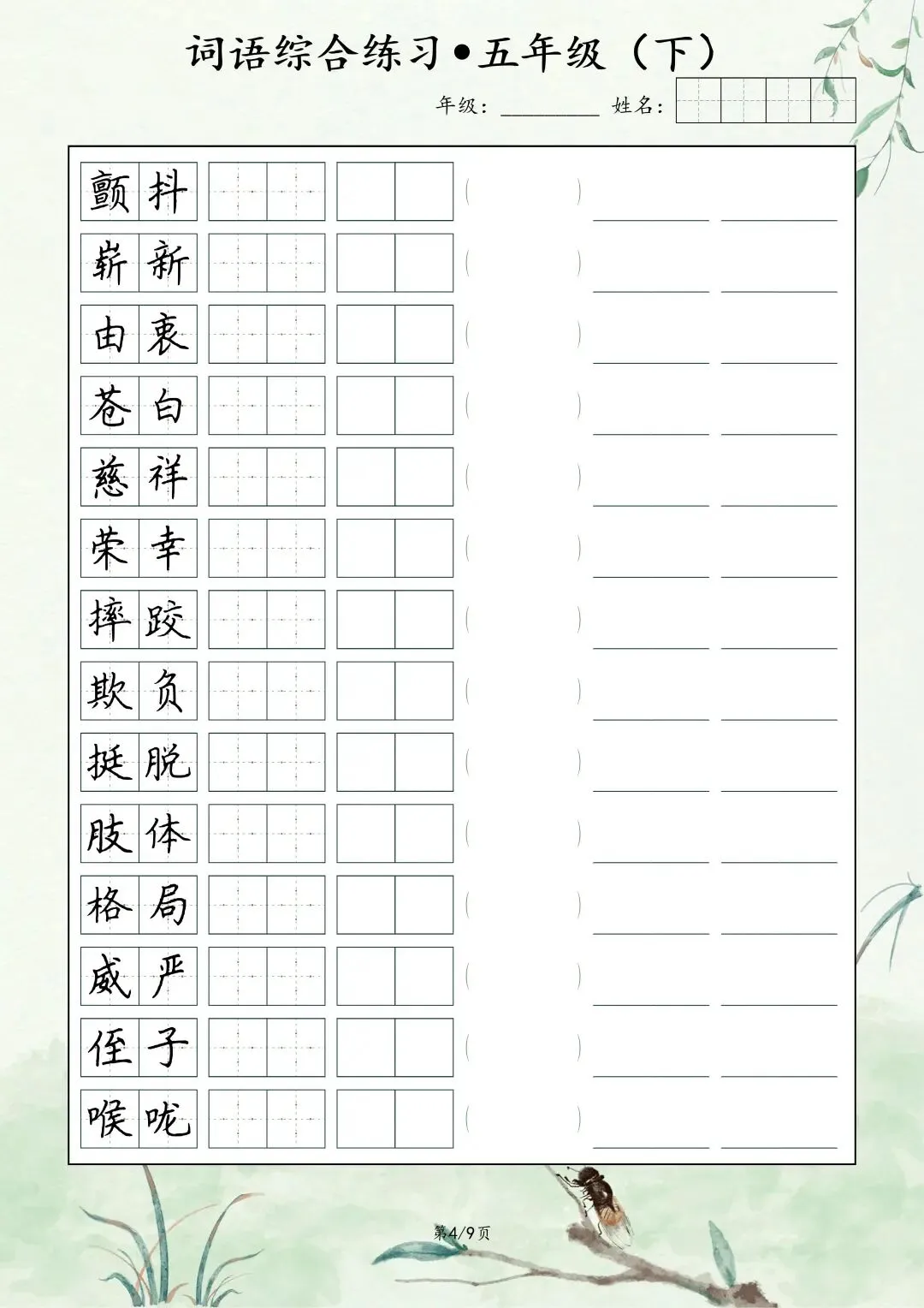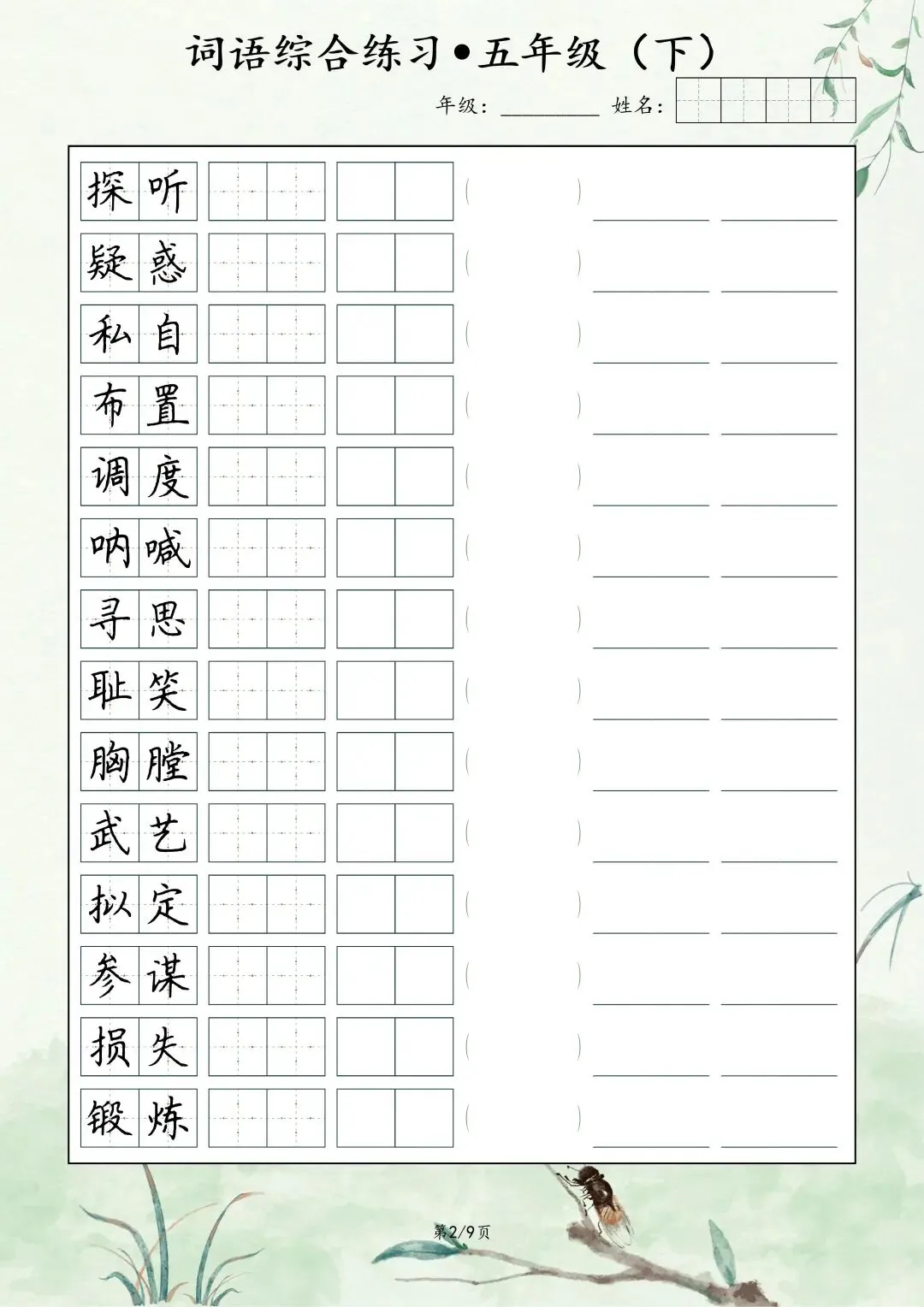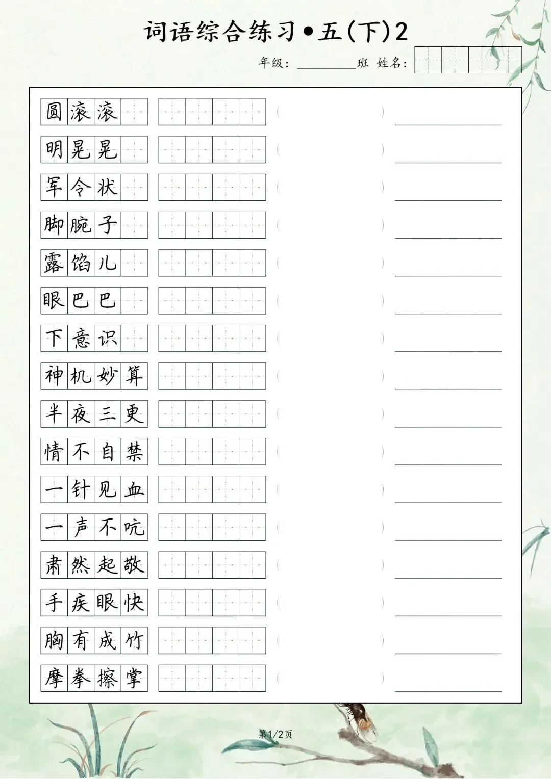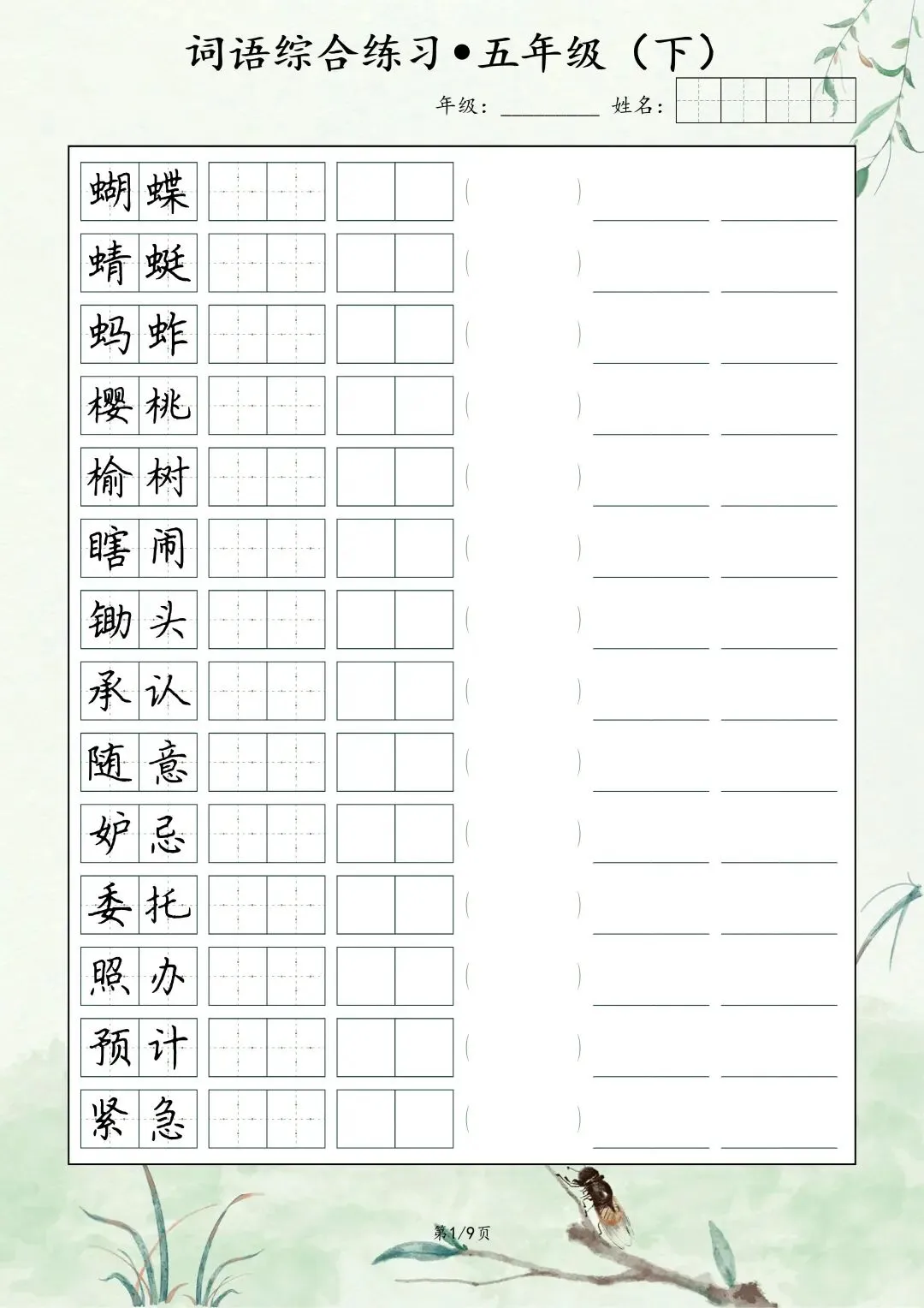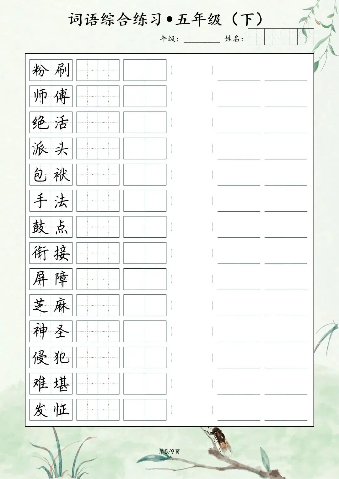 五年级(下)语文同步必背词语|可打印字帖(11页),练字+复习一步到位!