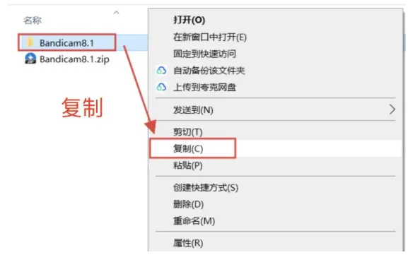 2、选择解压出来的【Bandicam】文件夹,鼠标右键进行【复制】