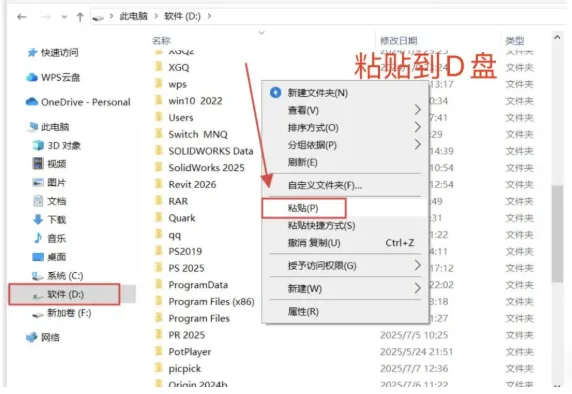 3、把复制的文件夹【粘贴】到合适的位置,推荐D盘或者E盘