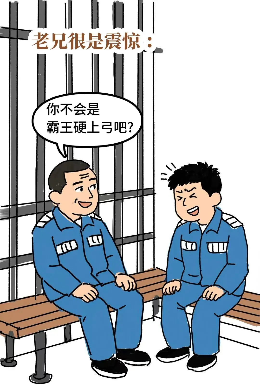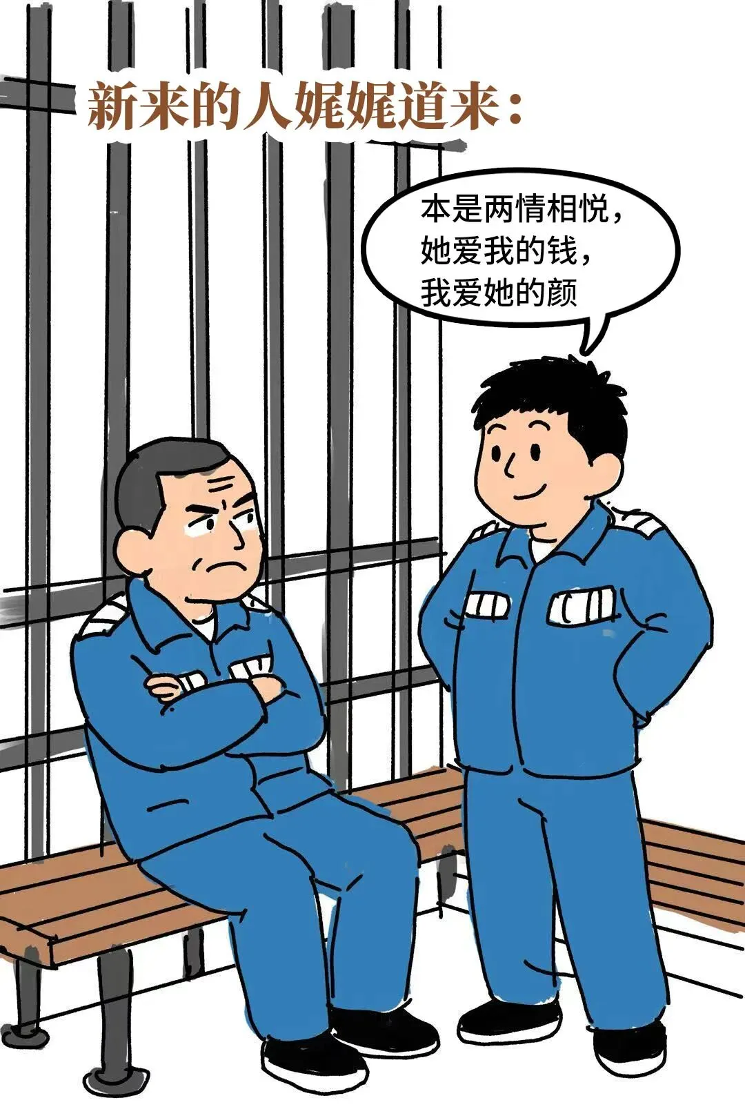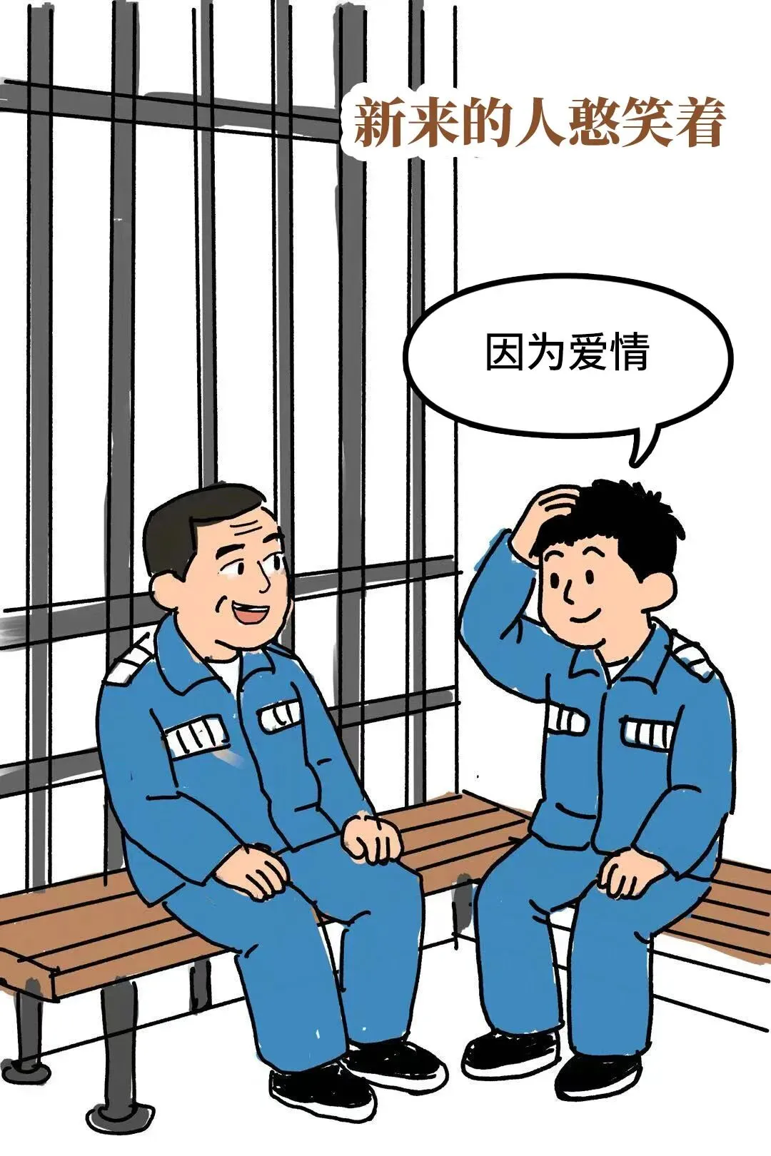 趣味漫画:拘留所里,老犯人问新来的犯了啥事,新人说因爱情.老犯调侃莫非霸王硬上弓,新人叹道:发展太快,被抓了.