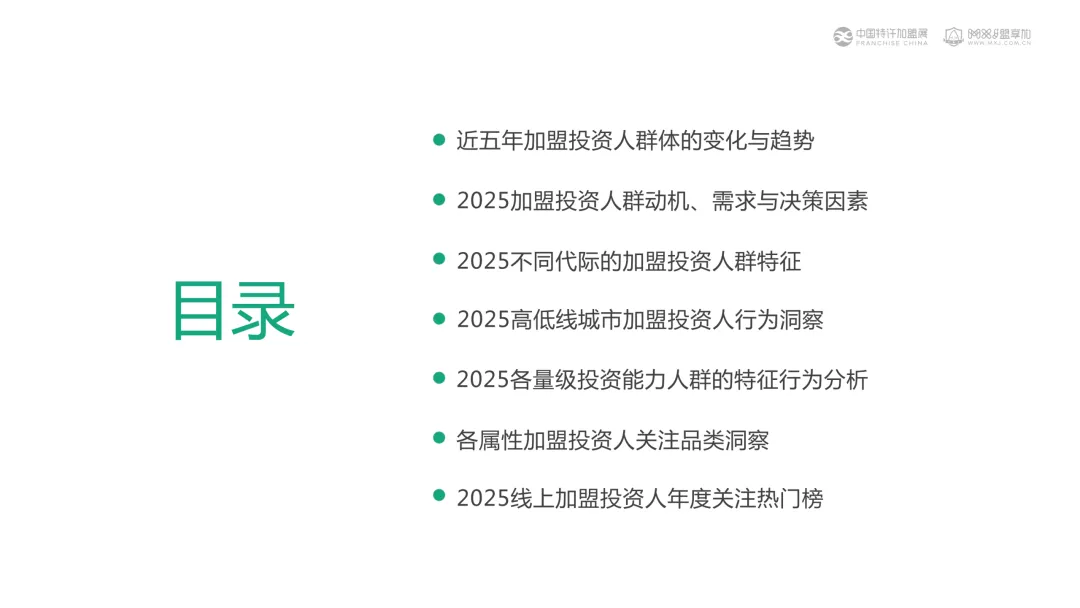 关注公众号,然后在首页对话框回复关键词“2025加盟投资人群洞察报告”,