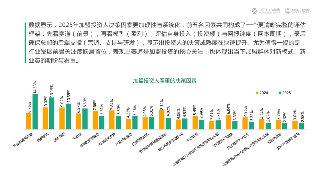 前五因素形成清晰评估框架:赛道 → 盈利模式 → 投资额 → 回本周期 → 总部支持;